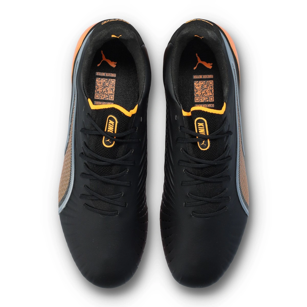 Chaussure Puma King Ultimate MxSG pour adultes en noir, feu de chaleur, argent. Chaussures pour jouer sur des terrains en herbe naturelle humide ou humide et des terrains de football avec de l'herbe fraîchement arrosée.