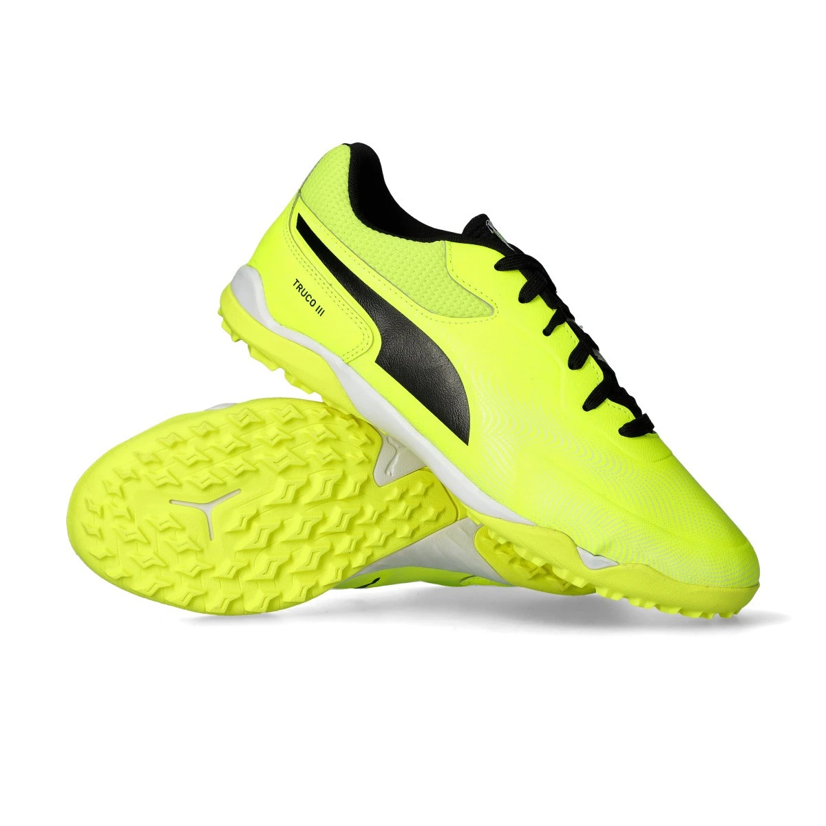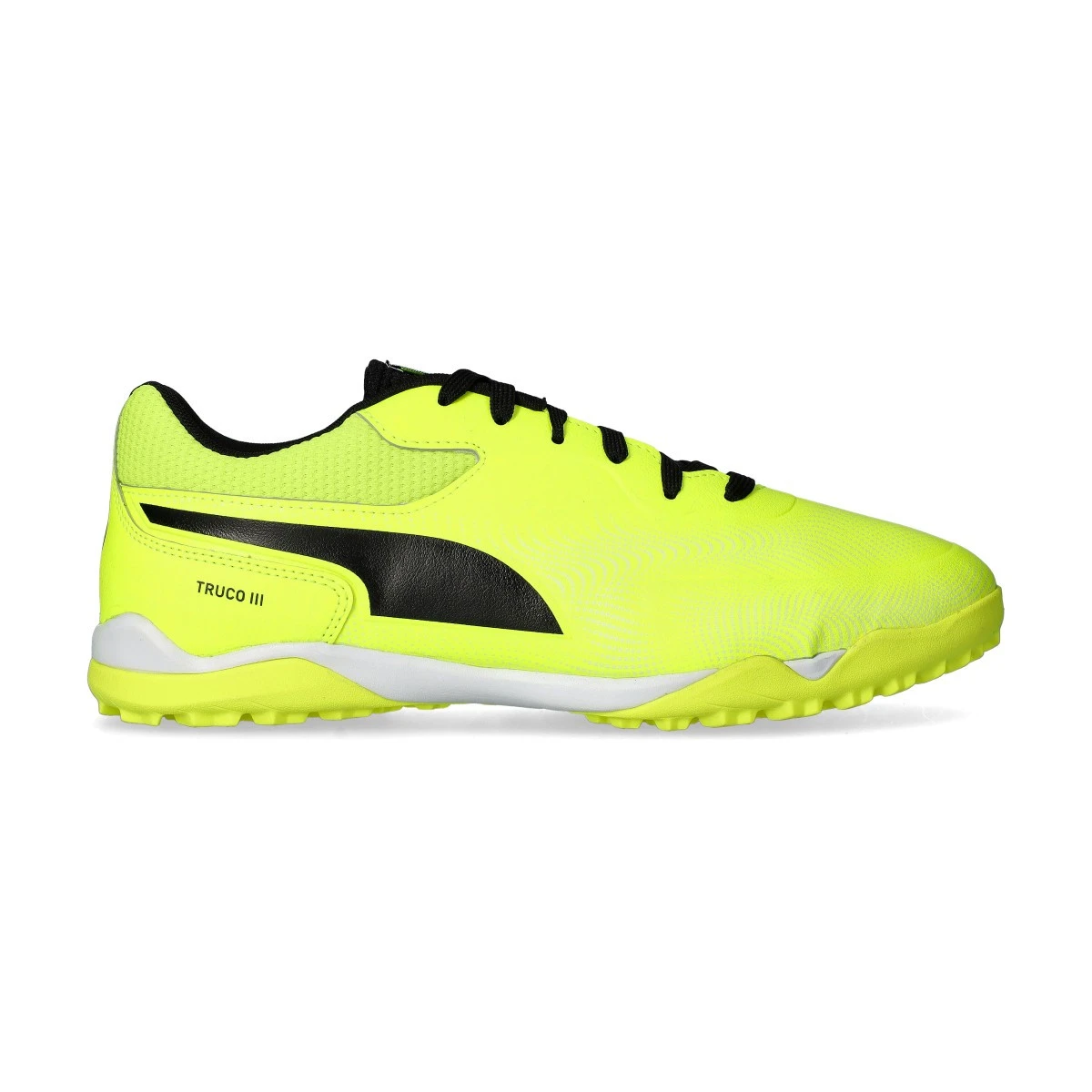 Chaussures de futsal Puma Truco III Turf. La Truco III est la chaussure de futsal pour homme par excellence pour les amateurs de sport. Ces chaussures offrent une semelle légère et flexible pour une plus grande mobilité et une protection optimale des orteils et du talon. De plus, leur design esthétique vous permettra de vous démarquer sur le terrain.
