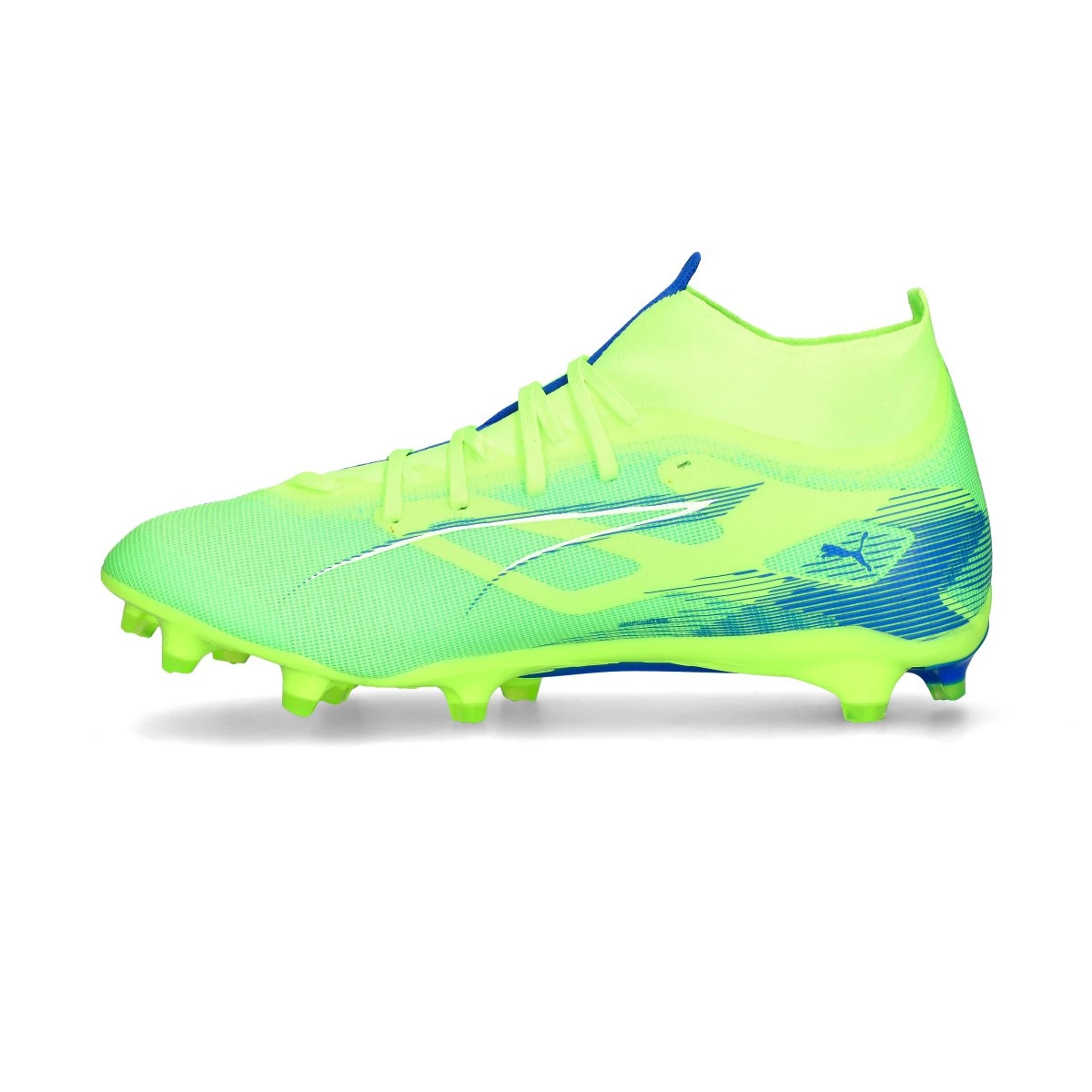 Chaussures de football Puma Ultra 5 Match+ FG/AG. Chaussures synthétiques à lacets pour utilisation sur tapis et terrains de gazon naturel et artificiel. Chaussures basse de gamme dans le coloris Fizzy Apple-White-Bluemazing.