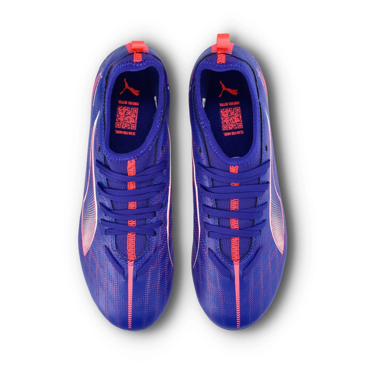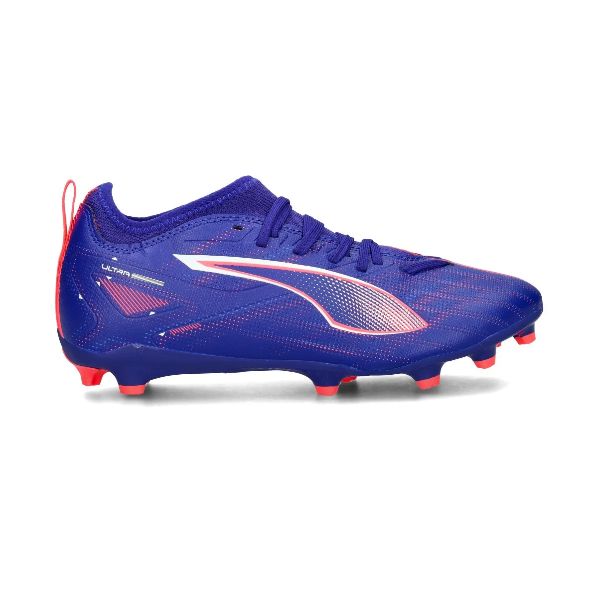 Chaussures de football Puma Ultra 5 Match Volume Up FG/AG pour enfants. Chaussures synthétiques à utiliser sur les terrains en gazon artificiel et en gazon naturel. Chaussures bas de gamme en couleur Lapis Lazuli-White-Sunset Glow.