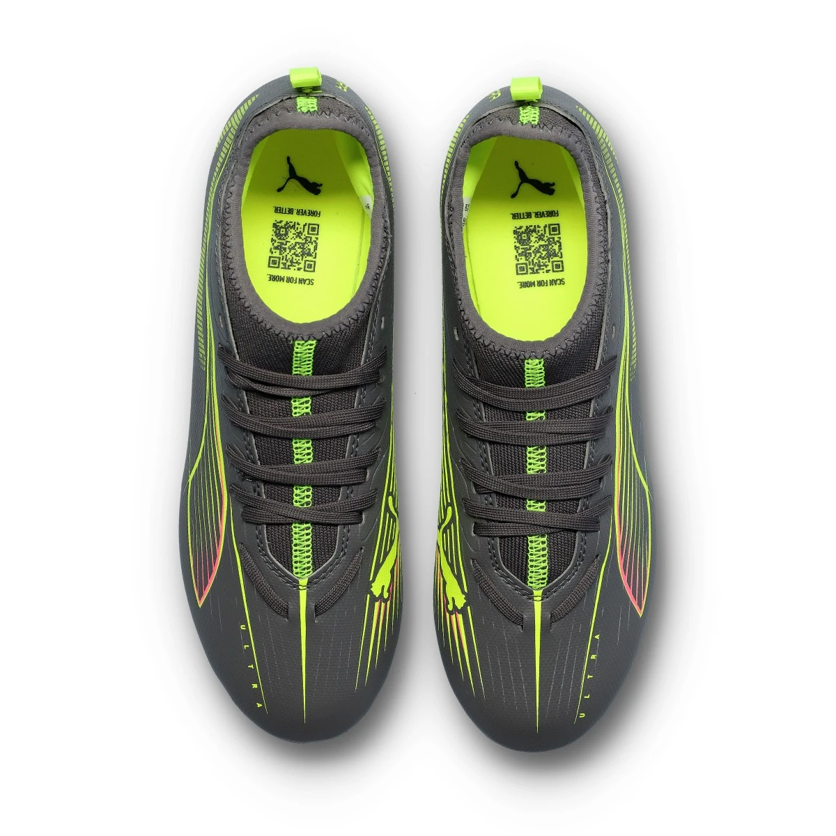 Chaussures de football Puma Ultra 5 Match Volume Up FG/AG pour enfants. Chaussures synthétiques à utiliser sur les terrains en gazon artificiel et en gazon naturel. Chaussures bas de gamme en Matte Aged Silver-Yellow Alert-Puma Aged Silv.