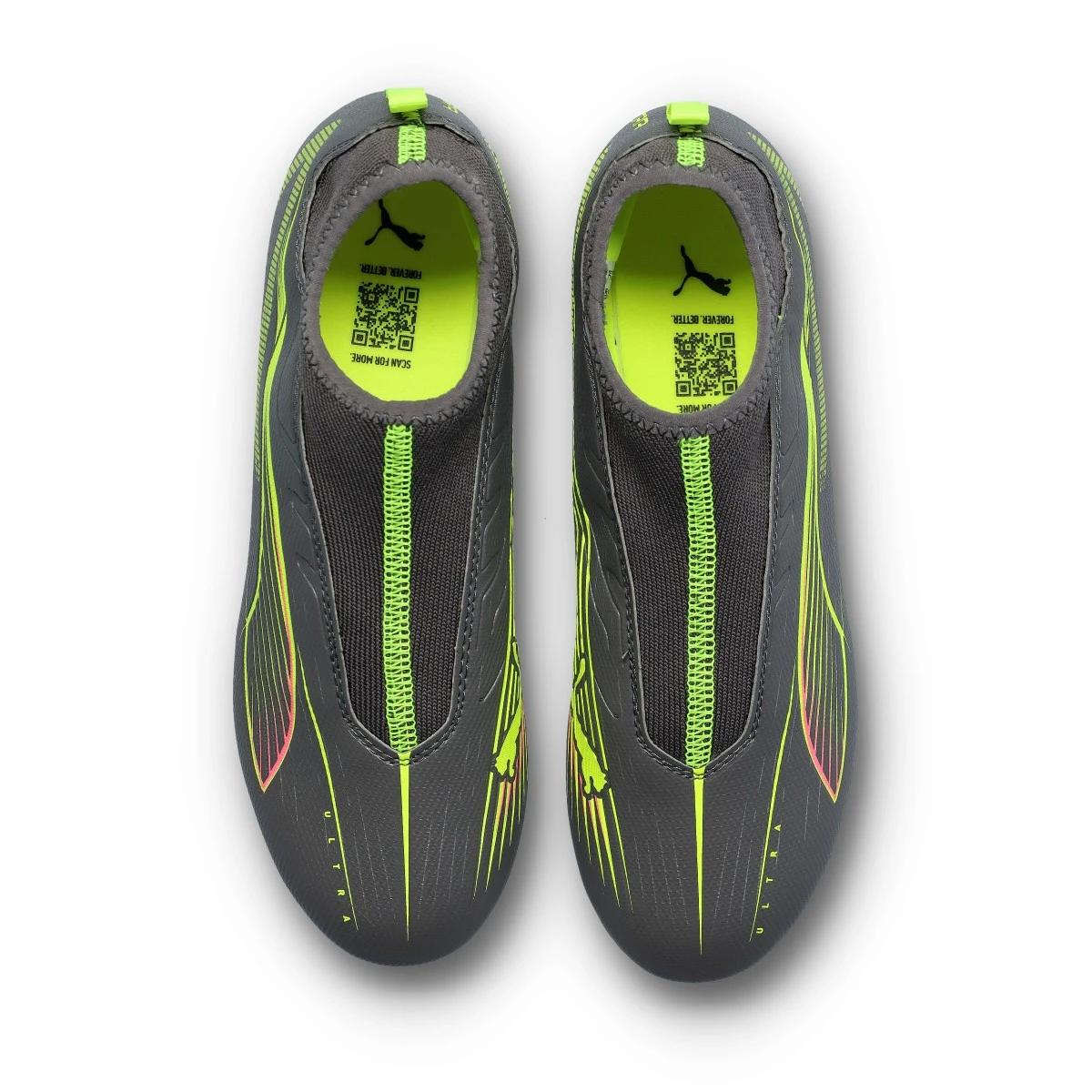 Chaussures de football Puma Ultra 5 Match+ LL FG/AG pour garçons. Chaussures synthétiques sans lacets à utiliser sur les terrains en gazon artificiel et en gazon naturel. Chaussures bas de gamme en Matte Aged Silver-Yellow Alert-Puma Aged Silv.