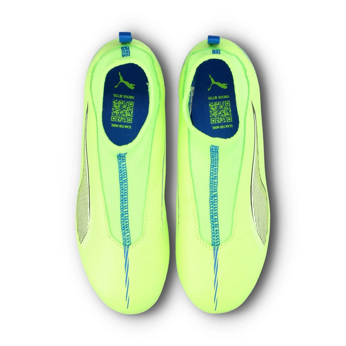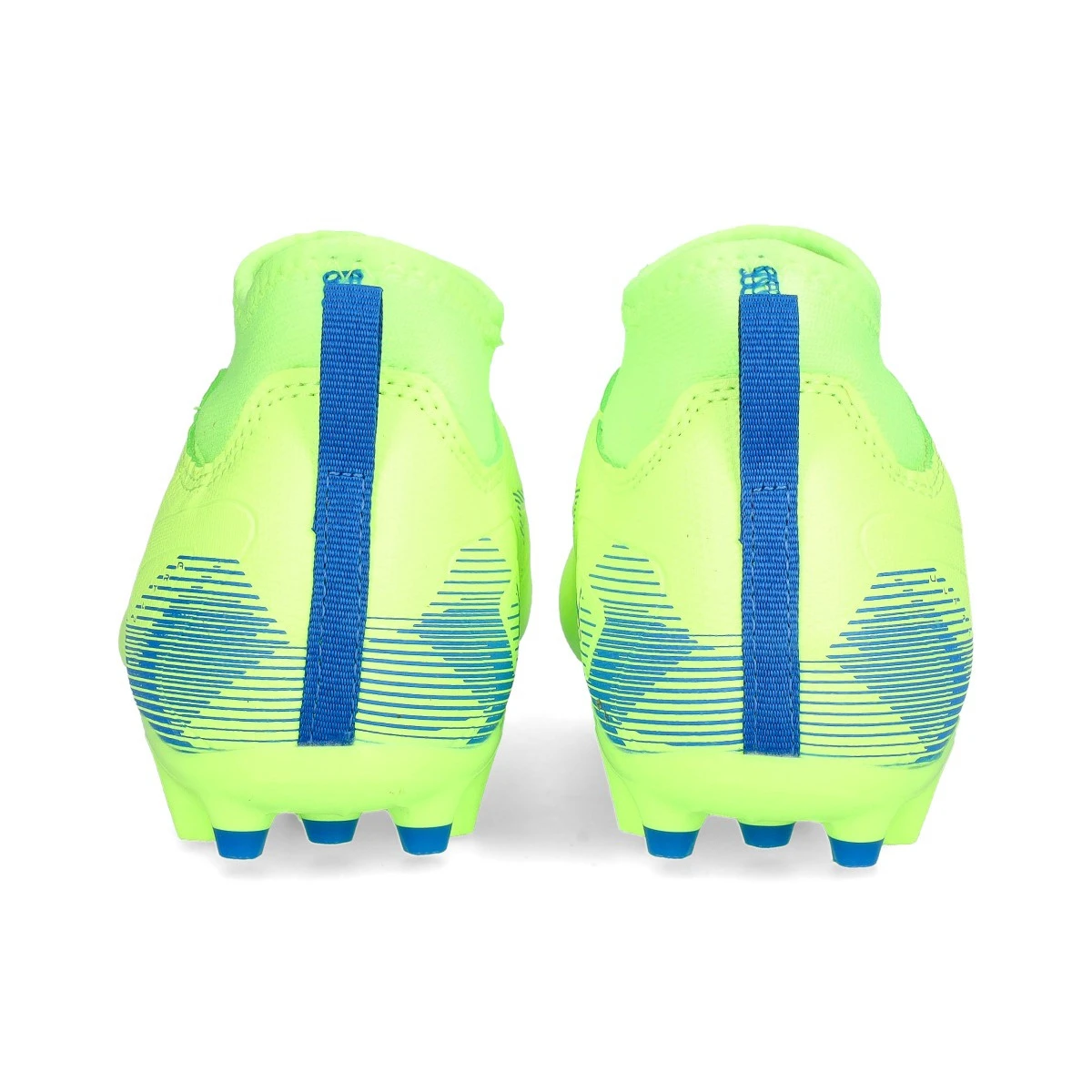 Chaussures de football Puma Ultra 5 Match+ LL MG pour enfants. Chaussures synthétiques sans lacets à utiliser sur les terrains en gazon artificiel et en gazon naturel. Chaussures bas de gamme en coloris Fizzy Apple-White-Bluemazing.