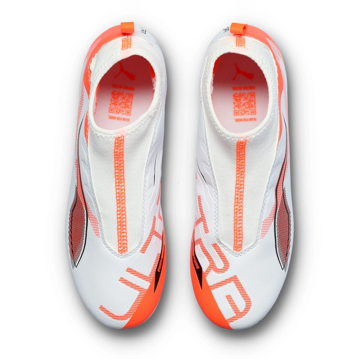 Chaussures de football Puma Ultra 5 Match+ LL MG pour enfants. Chaussures synthétiques sans lacets à utiliser sur les terrains en gazon artificiel et naturel. Chaussures bas de gamme en White-White-Glowing Red.