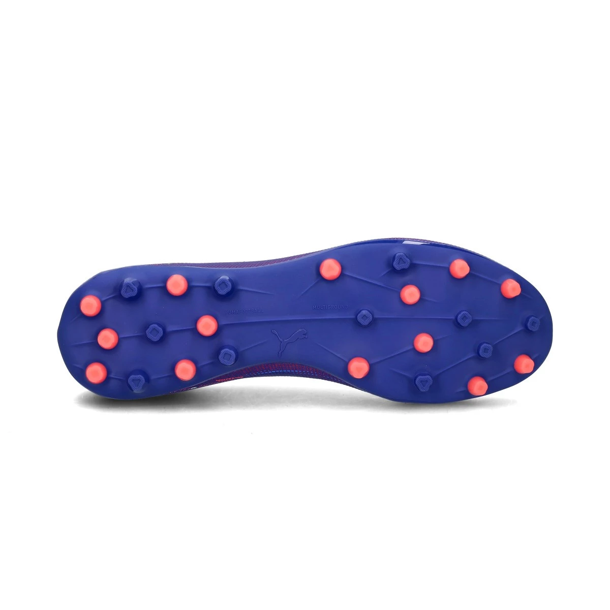 Chaussures de football Puma Ultra 5 Match MG. Chaussures synthétiques pour une utilisation sur les terrains en gazon artificiel de première génération. Chaussures bas de gamme en couleur Lapis Lazuli-White-Sunset Glow.