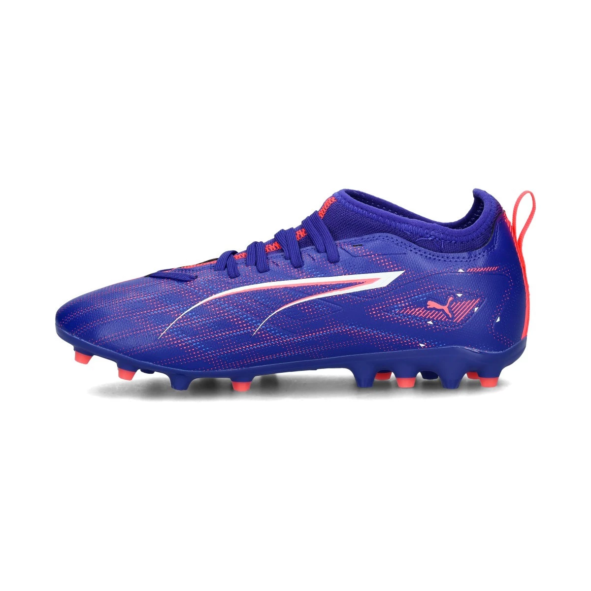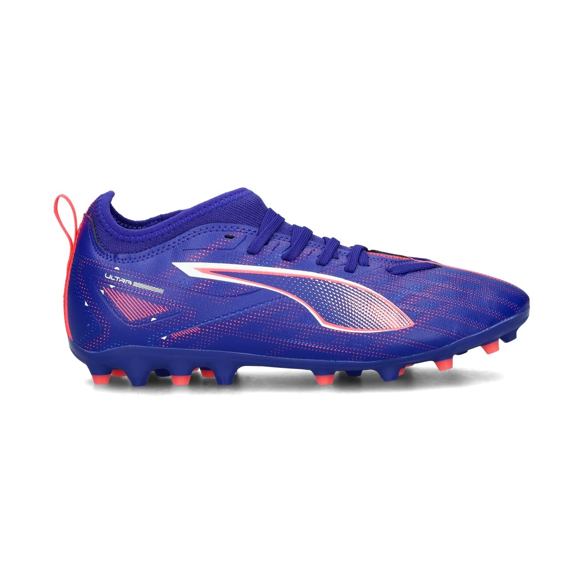 Chaussures de football Puma Ultra 5 Match MG pour enfant. Chaussures synthétiques sans lacets à utiliser sur les terrains en gazon artificiel et en gazon naturel. Chaussures bas de gamme en couleur Lapis Lazuli-White-Sunset Glow.