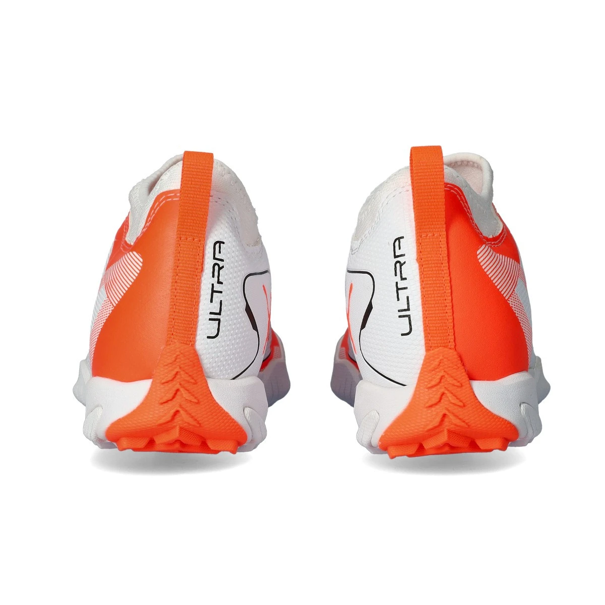 Chaussures de football Puma Ultra 5 Match Turf + Mid pour enfants. Chaussures synthétiques avec lacets pour utilisation sur gazon artificiel et moquette. Chaussures bas de gamme en White-White-Glowing Red.