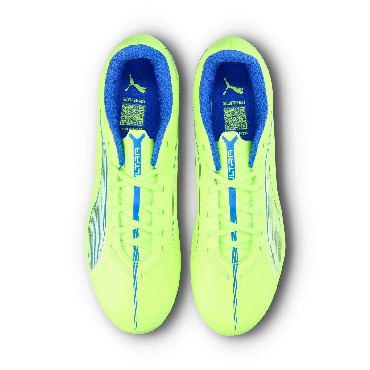 Chaussures de football Puma Ultra 5 Play FG/AG. Chaussures synthétiques à utiliser sur des terrains en gazon artificiel et naturel. Chaussures basse gamme dans le coloris Fizzy Apple-White-Bluemazing.