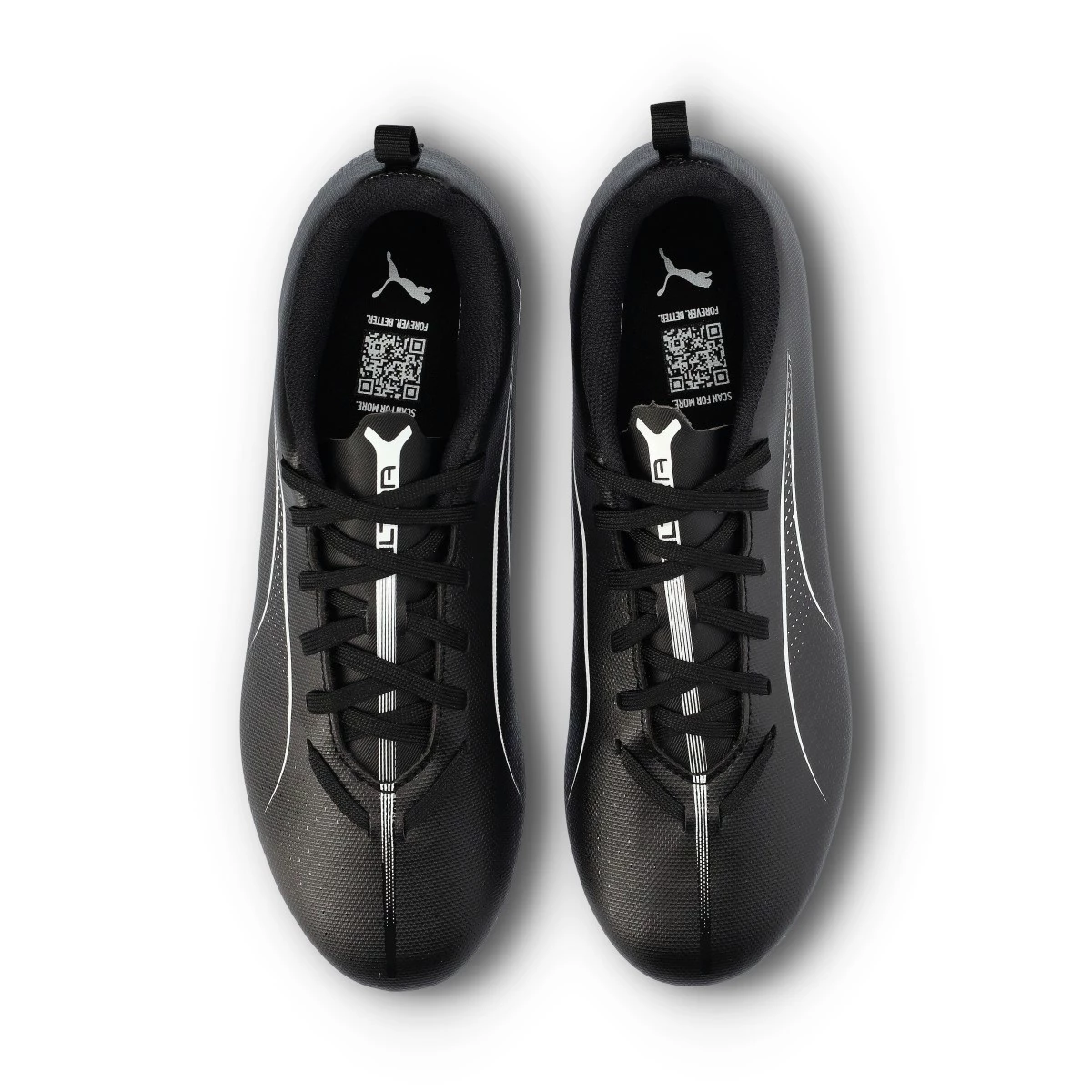 Chaussures de football Puma Ultra 5 Play FG/AG pour enfant. Chaussures synthétiques à utiliser sur les terrains en gazon artificiel et en gazon naturel. Chaussures bas de gamme en Black-White.