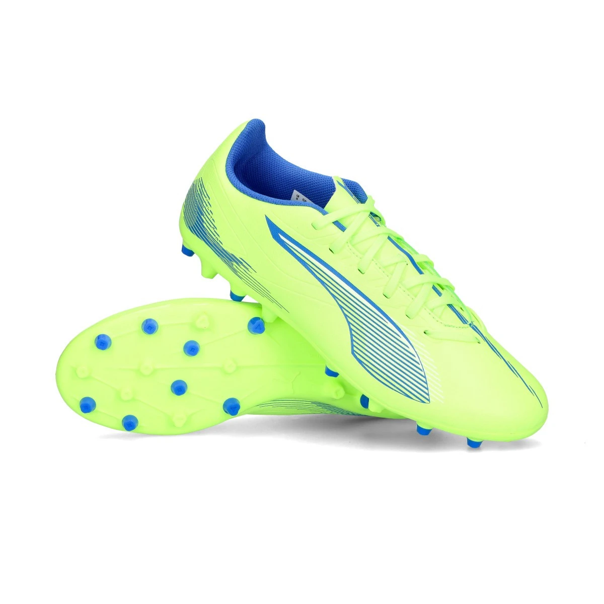 Chaussures de football Puma Ultra 5 Play MG. Chaussures synthétiques à utiliser sur des terrains en gazon artificiel de première génération. Chaussures basse gamme dans le coloris Fizzy Apple-White-Bluemazing.