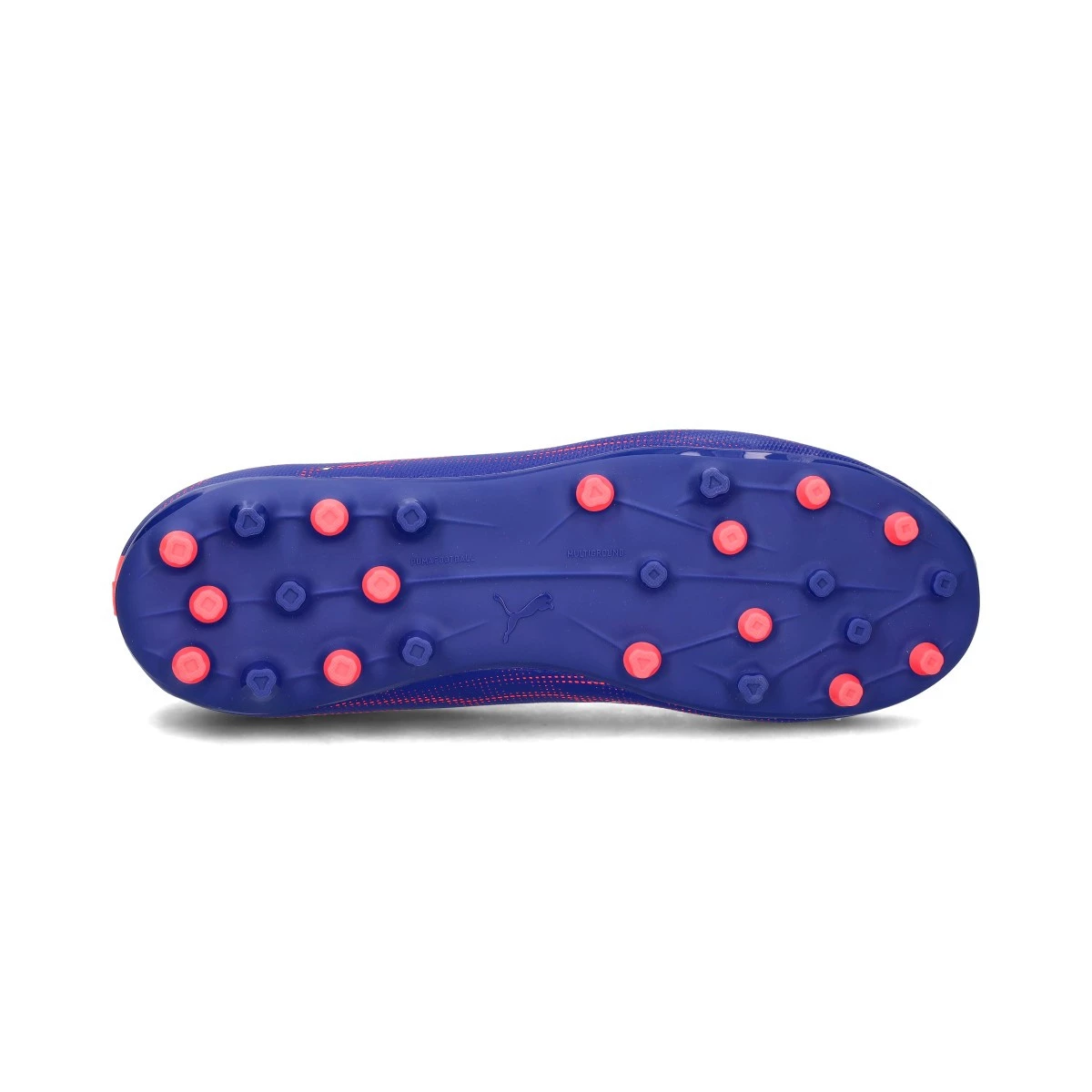 Chaussures de football Puma Ultra 5 Play MG pour enfant. Chaussures synthétiques pour une utilisation sur les terrains en gazon artificiel de première génération. Chaussures bas de gamme en coloris Lapis Lazuli-White-Sunset Glow.