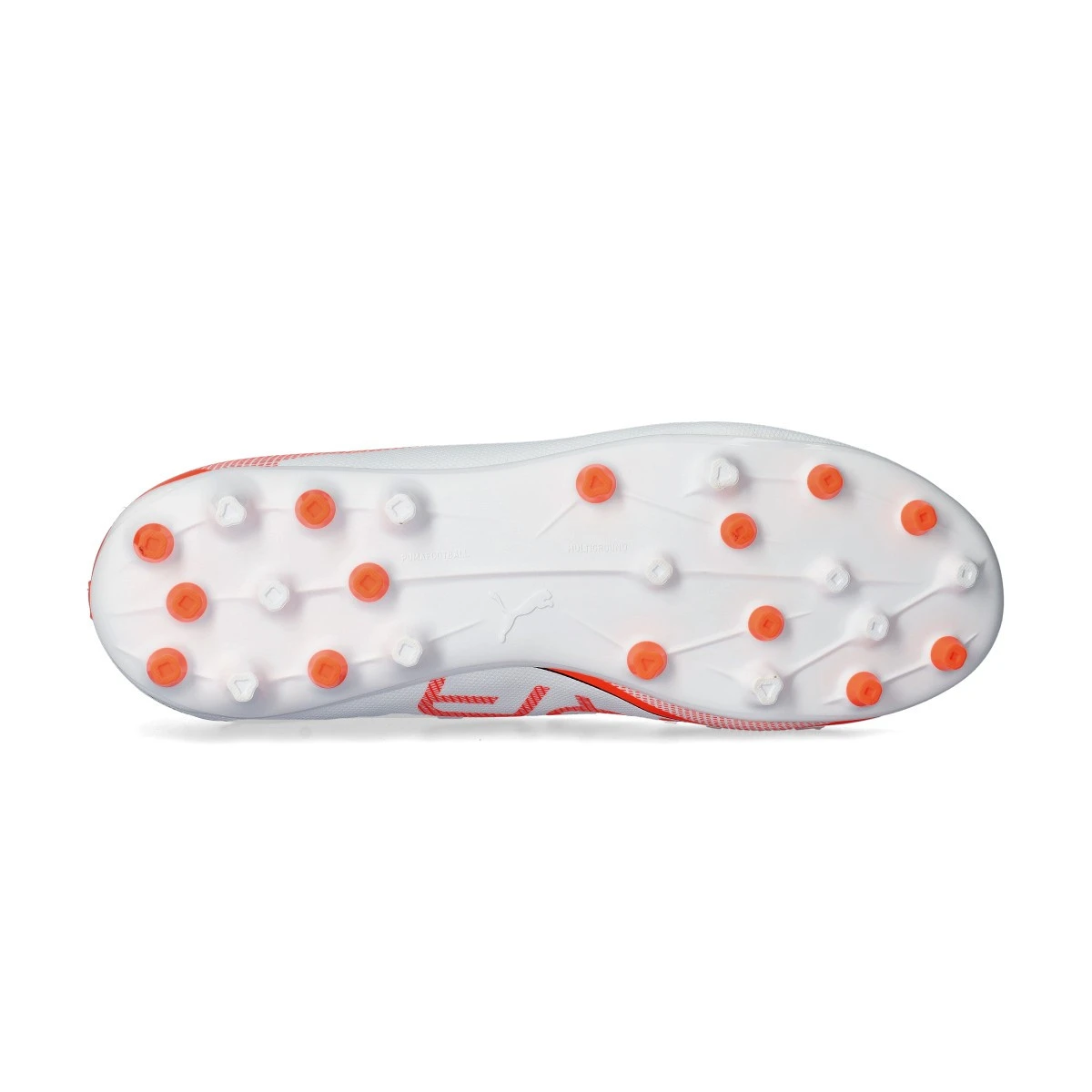 Chaussures de football Puma Ultra 5 Play MG pour enfants. Chaussures synthétiques pour utilisation sur les terrains en gazon artificiel de première génération. Chaussures bas de gamme en White-White-Glowing Red.