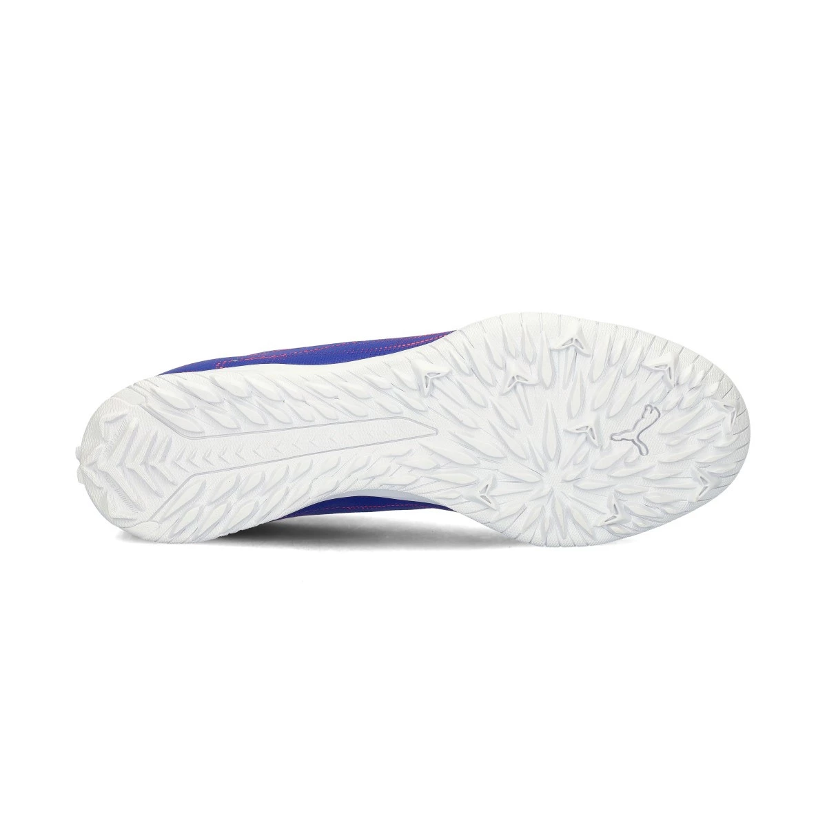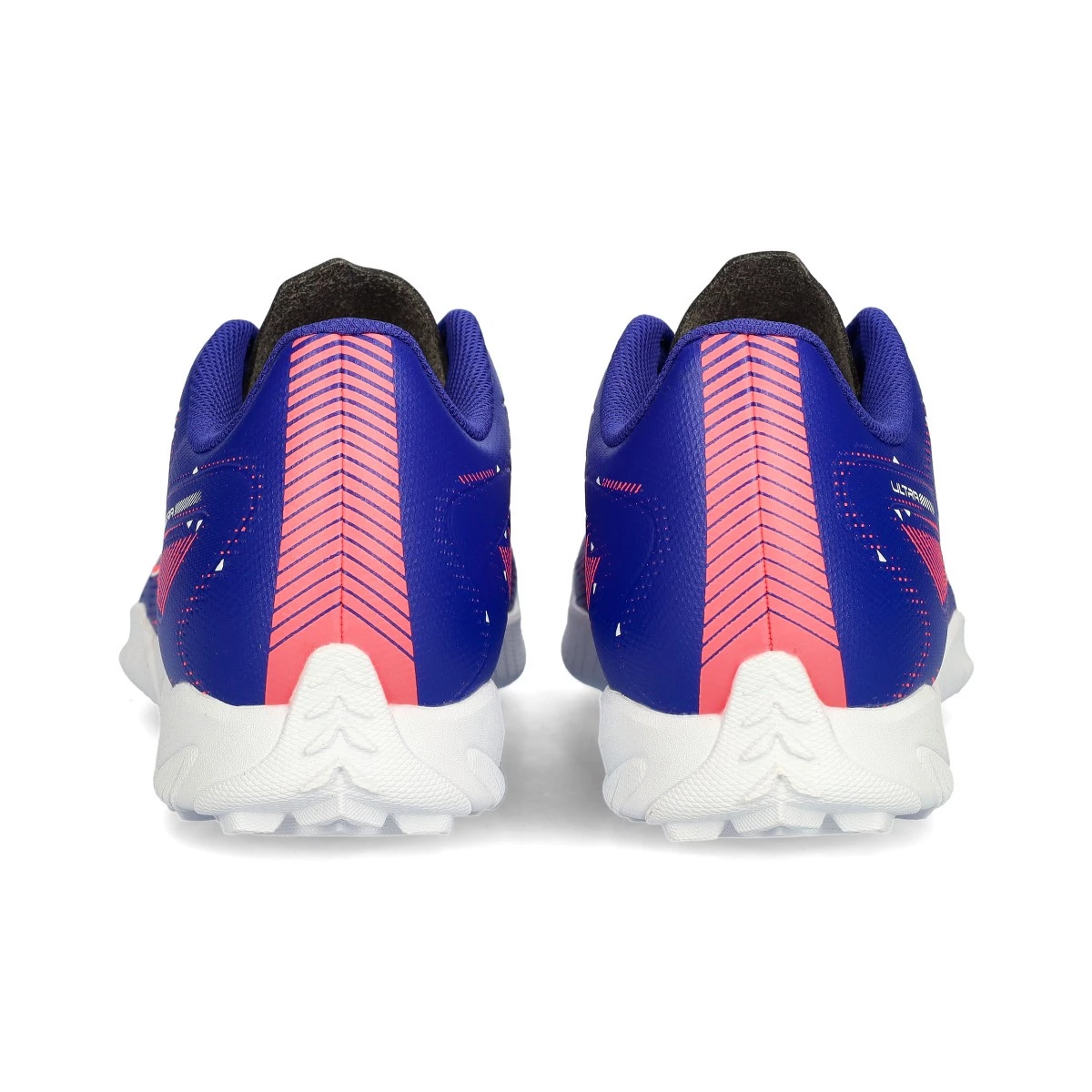 Chaussures de football Puma Ultra 5 Play Turf. Chaussures synthétiques à utiliser sur les terrains en gazon artificiel et en moquette. Chaussures de la gamme de base en couleur Lapis Lazuli-White-Sunset Glow.