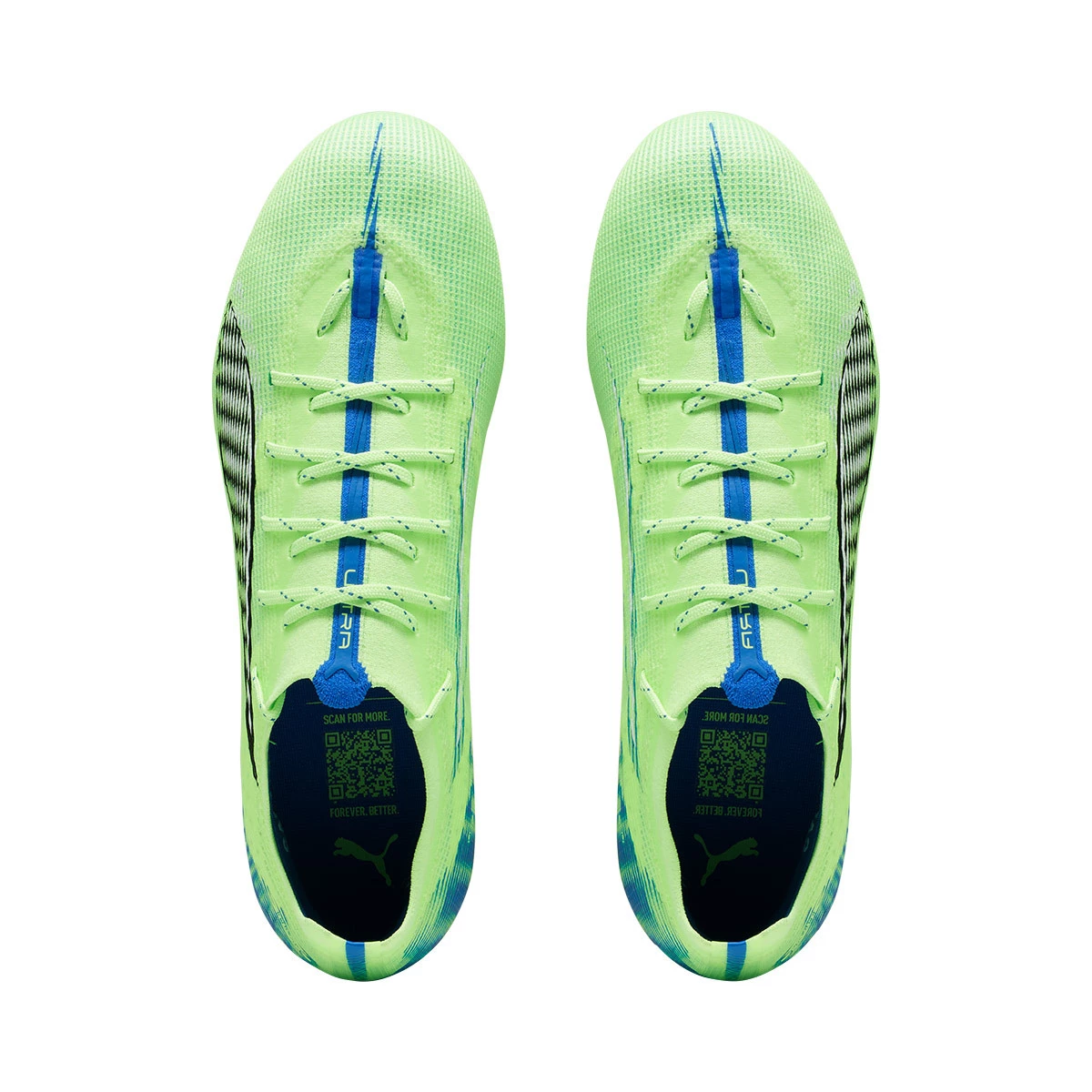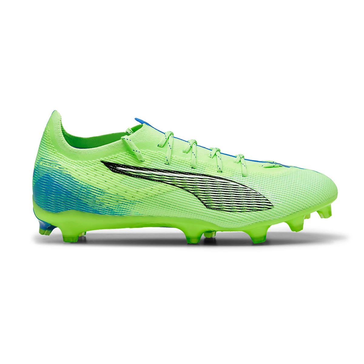Chaussures de football Puma Ultra Pro FG/AG. Chaussures en microfibre pour les terrains en gazon naturel et artificiel. Chaussures millieu de gamme dans le coloris Fizzy Apple-White-Bluemazing.