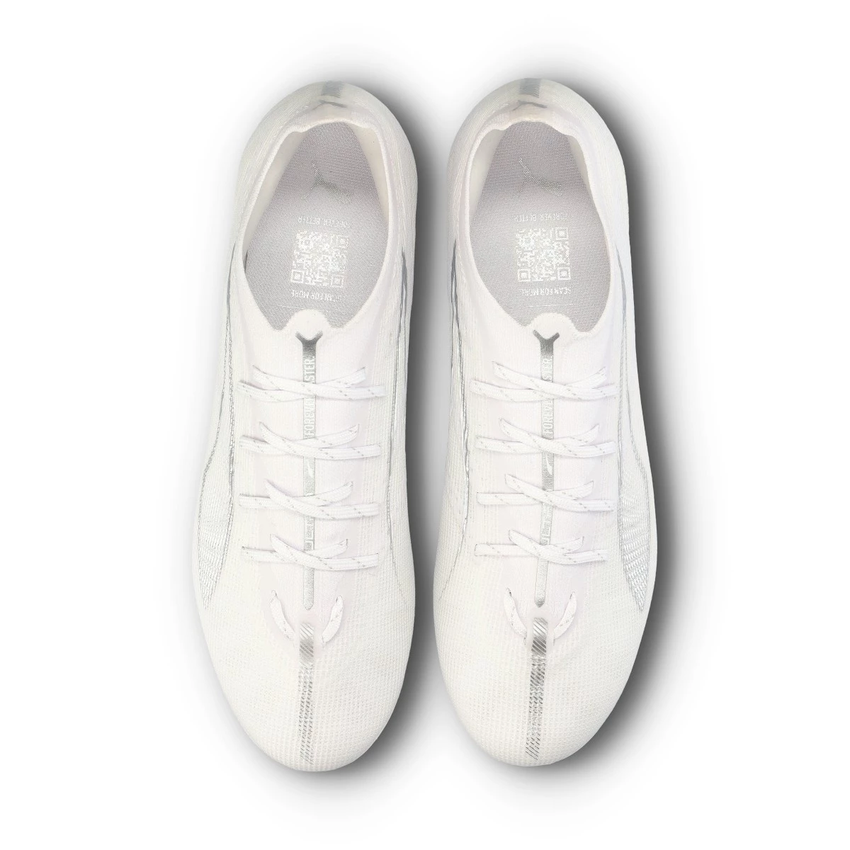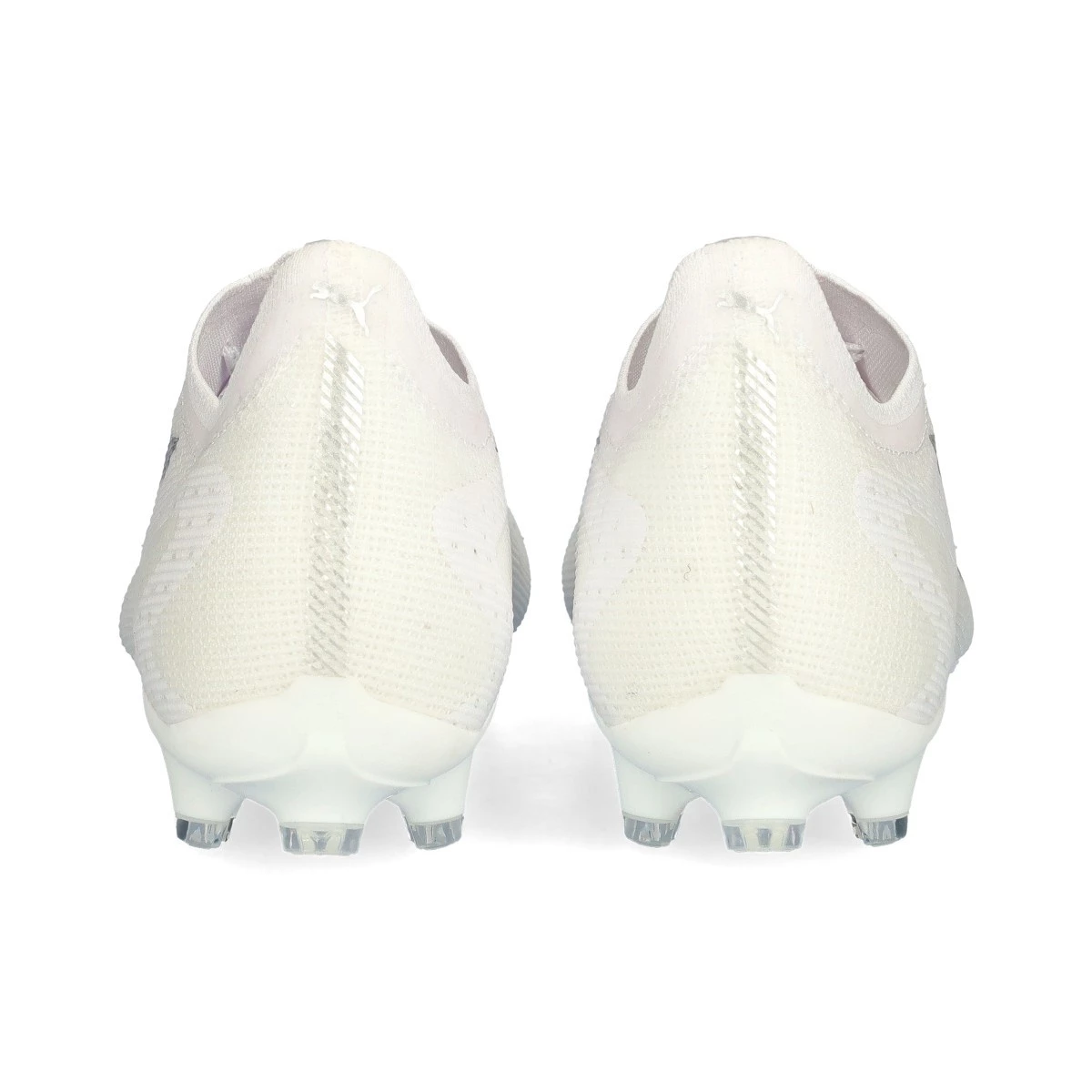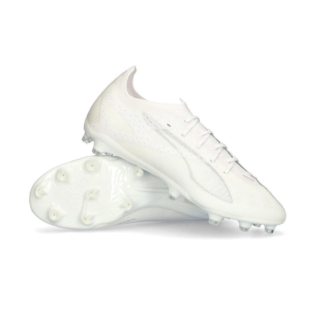 Chaussures de football Puma Ultra Pro FG/AG. Chaussures en microfibre à utiliser sur les terrains en gazon artificiel et en gazon naturel. Chaussures de milieu de gamme en White-White.