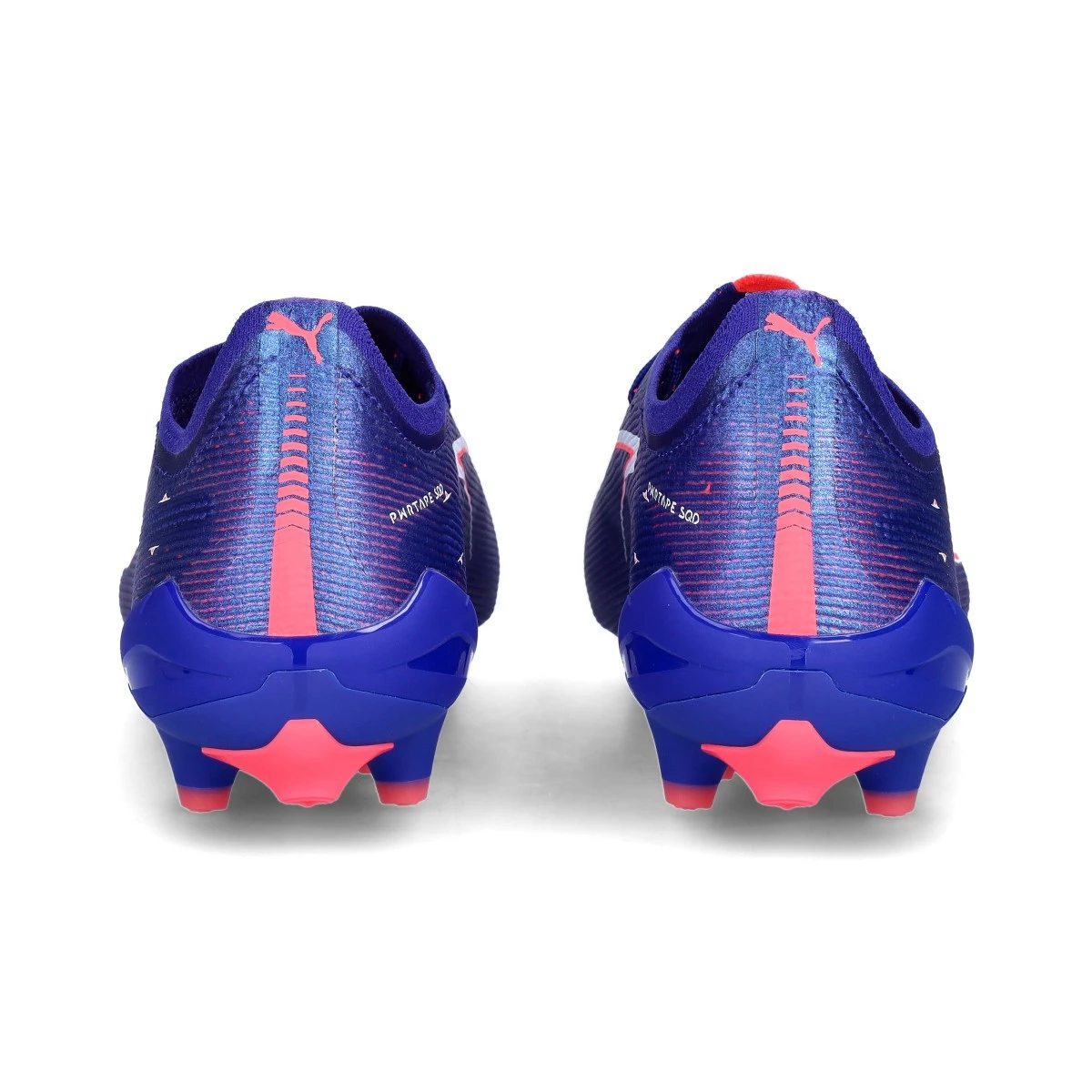 Chaussures de football Puma Ultra 5 Ultimate AG. Chaussures en microfibre pour une utilisation sur les terrains en gazon artificiel. Chaussures haut de gamme en Lapis Lazuli-White-Sunset Glow