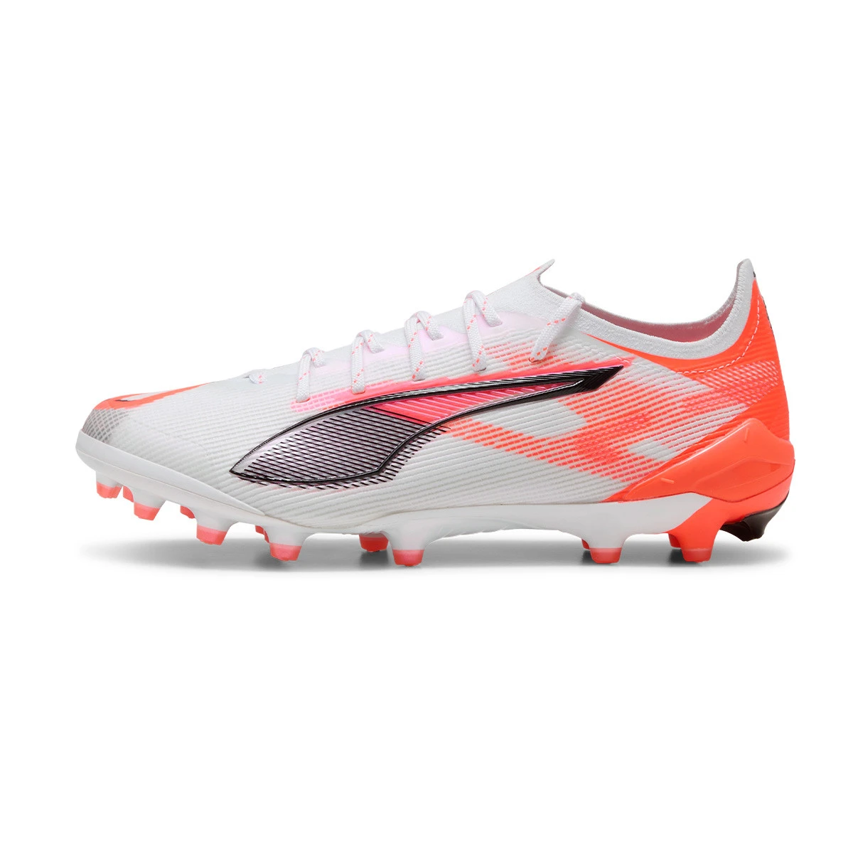 Chaussures de football Puma Ultra 5 Ultimate AG pour femmes. Chaussures en microfibre pour les terrains en gazon artificiel. Chaussures haut de gamme en White-White-Glowing Red.
