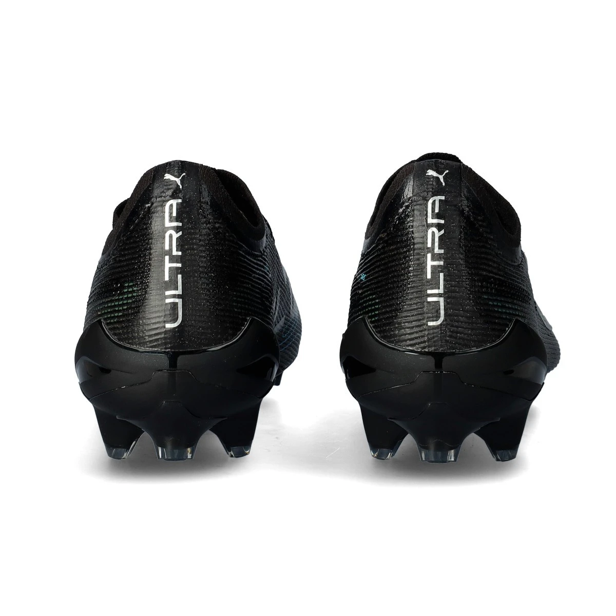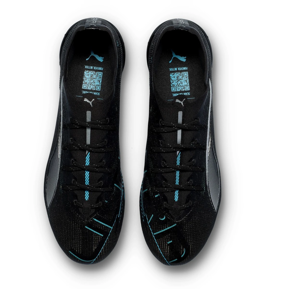 Chaussures de football Puma Ultra 5 Ultimate FG pour adultes. Modèles en microfibre pour une utilisation sur des terrains en gazon naturel. Chaussures haut de gamme de couleur Black-Silver-Bright Aqua.