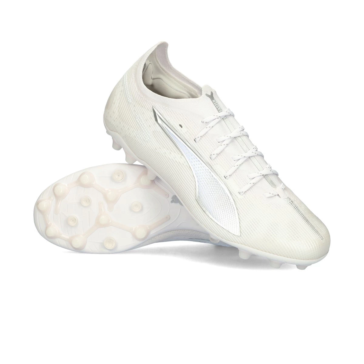 Chaussures de football Puma Ultra 5 Ultimate MG. Chaussures en microfibre pour une utilisation sur les terrains artificiels de première génération. Chaussures haut de gamme en couleur White-White.