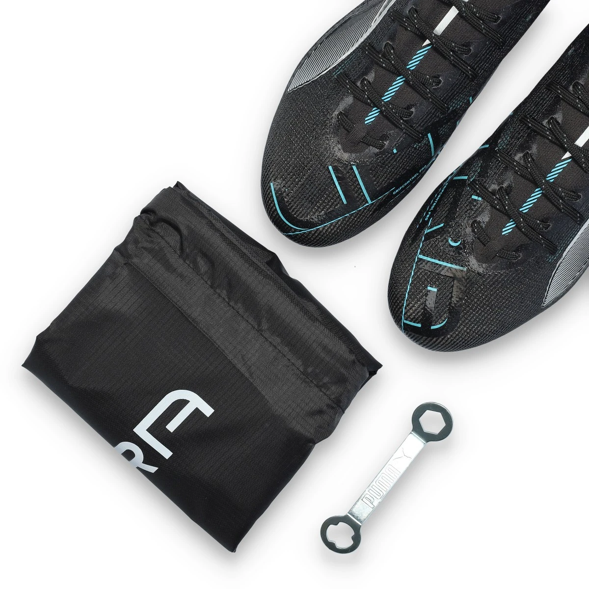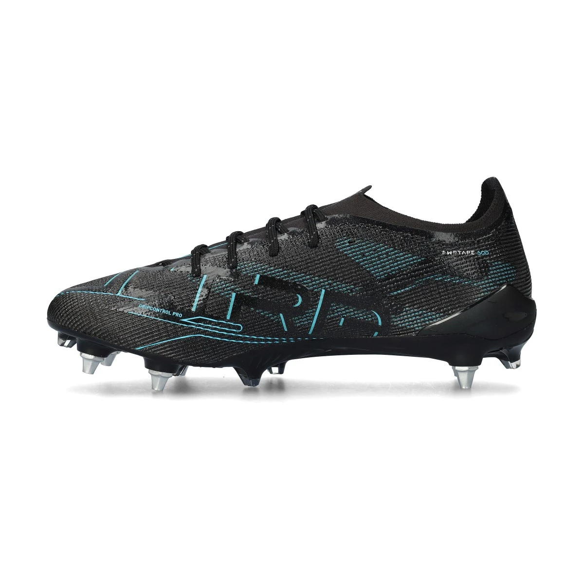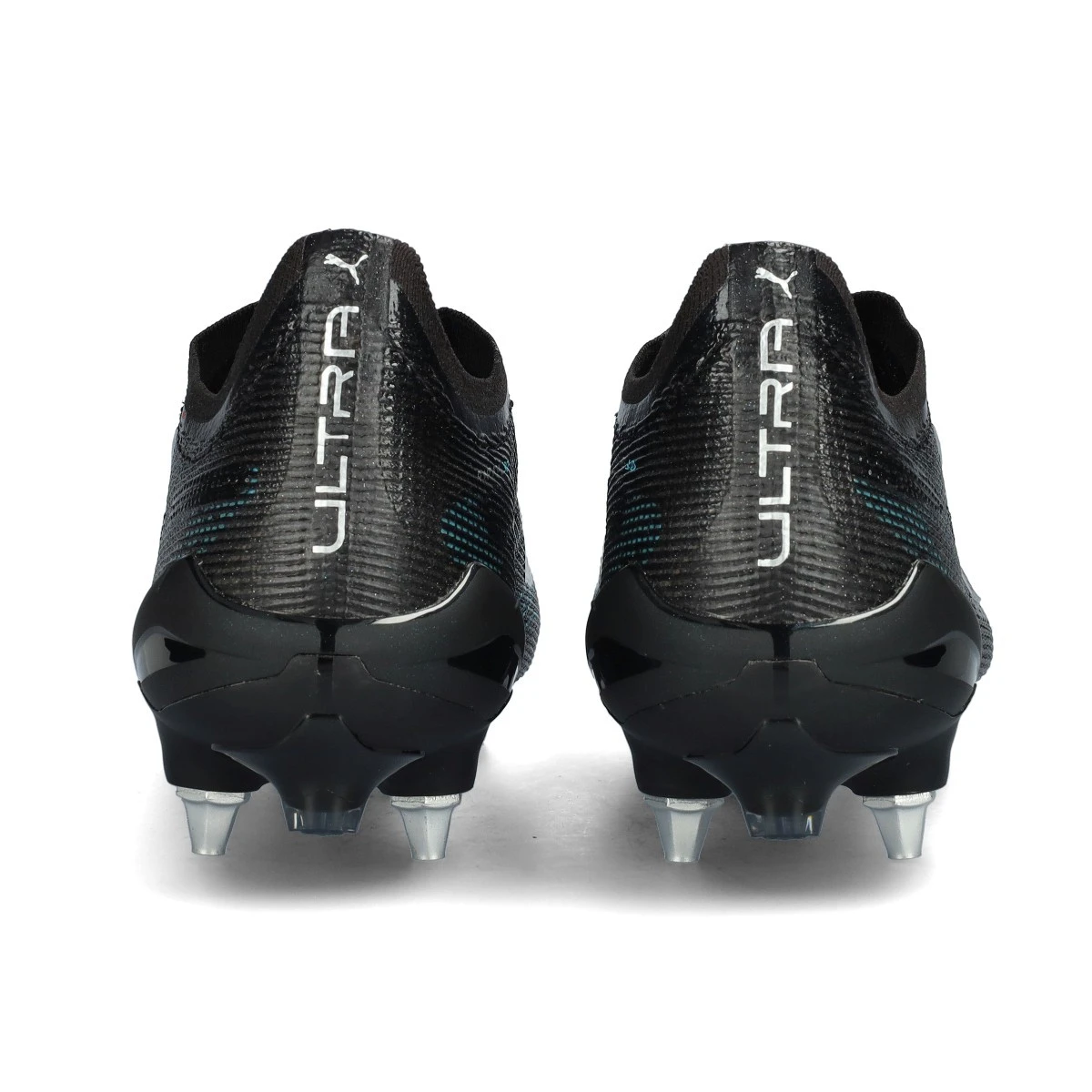Chaussures de football Puma Ultra 5 Ultimate MxSG pour adultes. Chaussures en microfibre pour utilisation sur terrains naturels humides. Chaussures haut de gamme de couleur Black-Silver-Bright Aqua.