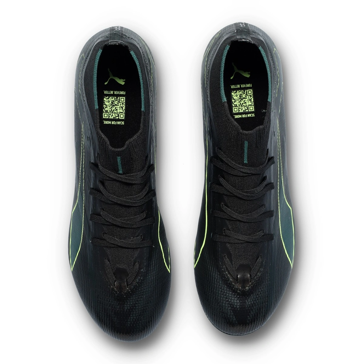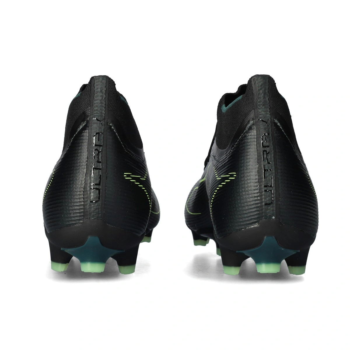 Chaussure de football Puma Ultra 6 Match+ LL FG/AG. Chaussures synthétiques à utiliser sur les terrains en gazon artificiel. Chaussures bas de gamme en coloris Black-Fizzy Light-Green Terrain.