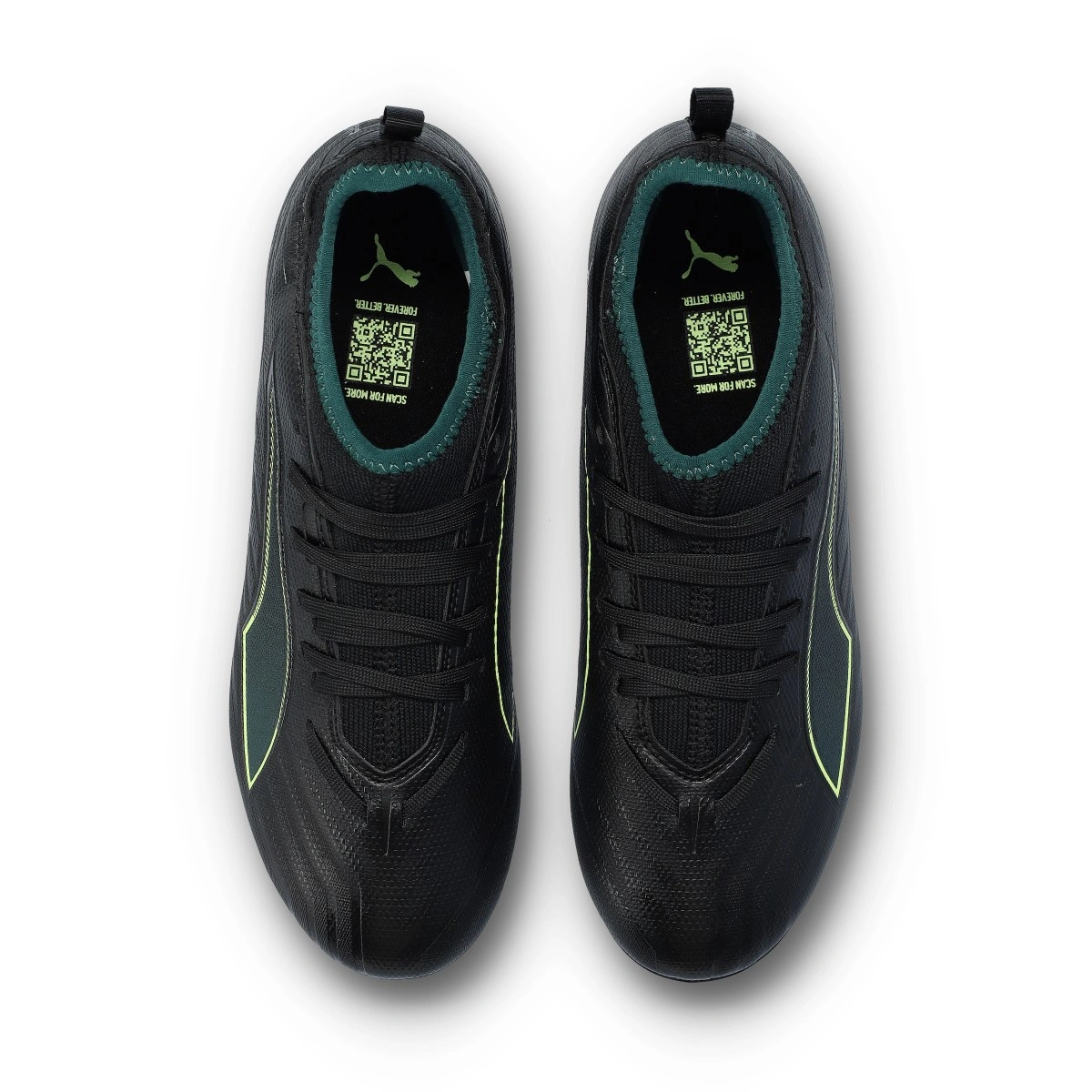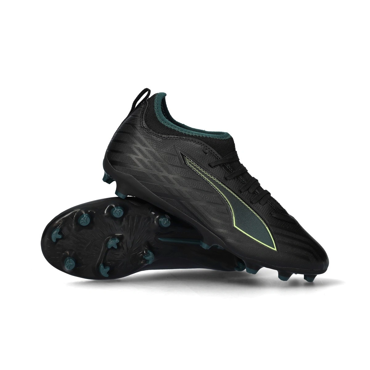 Chaussure de football Puma Ultra 6 Match FG/AG pour enfant. Chaussures synthétiques à utiliser sur les terrains en gazon artificiel et naturel. Chaussures bas de gamme en coloris Black-Fizzy Light-Green Terrain.
