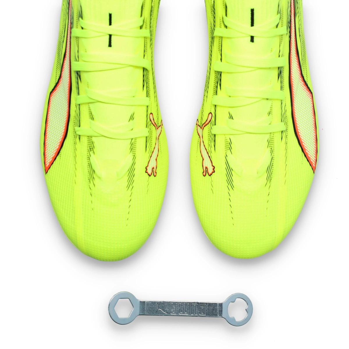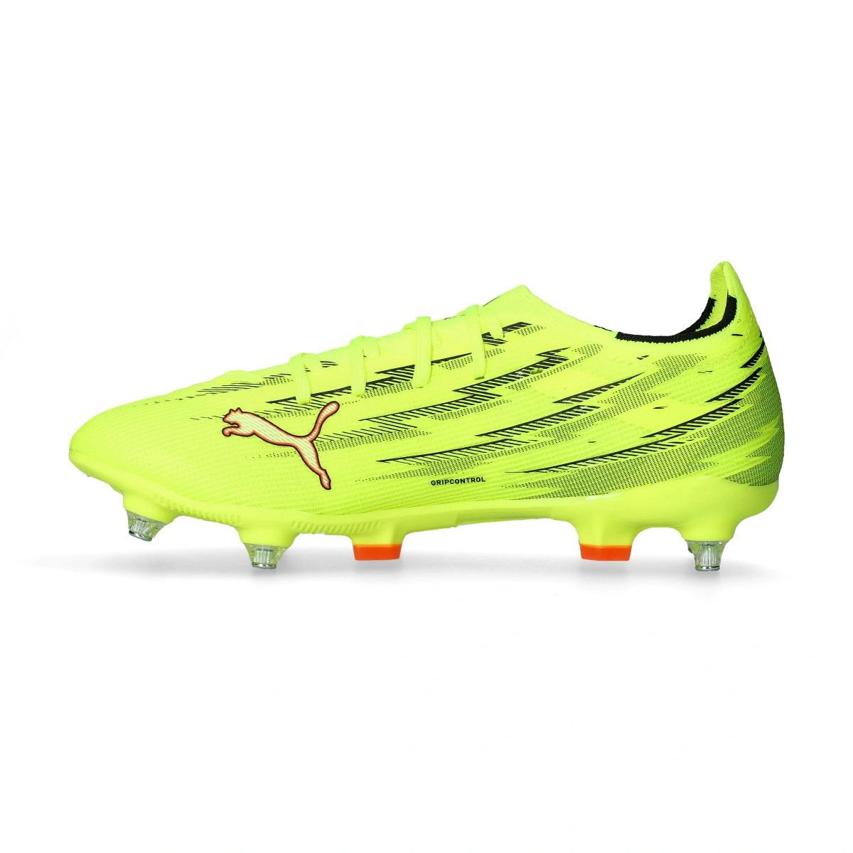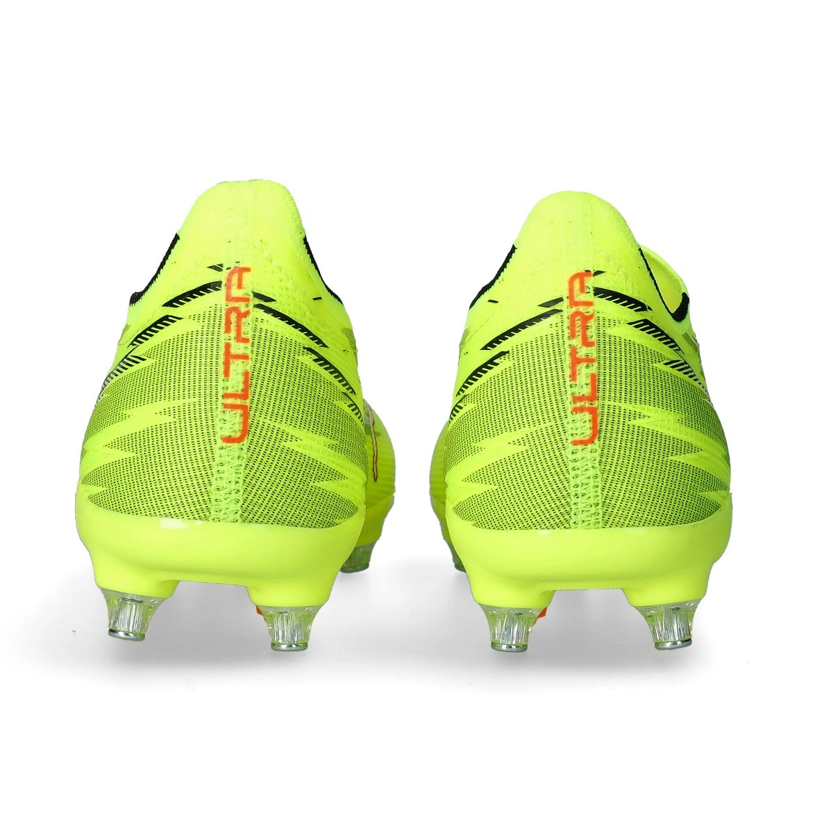 Chaussure de football Puma Ultra 6 Match SG pour adultes. Chaussures synthétiques à utiliser sur terrains en herbe naturelle humide. Chaussures d'entrée de gamme en couleur Yellow Alert-Puma Black-Puma Silver-Glowing R.