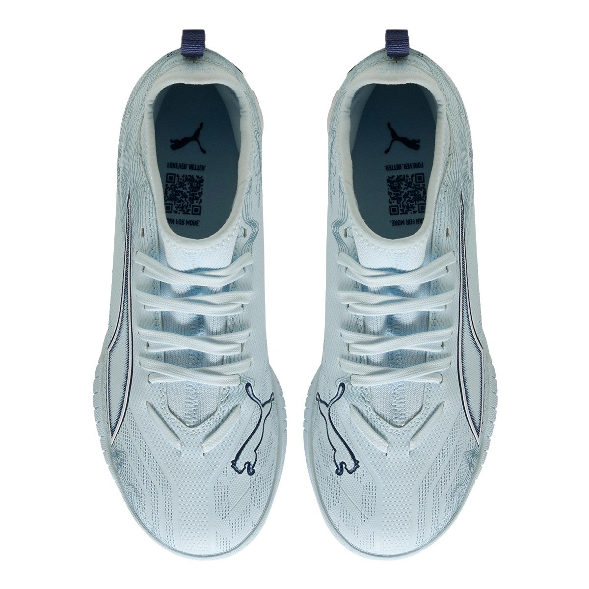 Chaussure de football Puma Ultra 6 Match+ LL Turf Mid Enfant. Chaussures synthétiques pour des terrains de gazon artificiel ou moquette. Chaussures d'entrée de gamme en couleur Icy Blue-Blue Jewel.