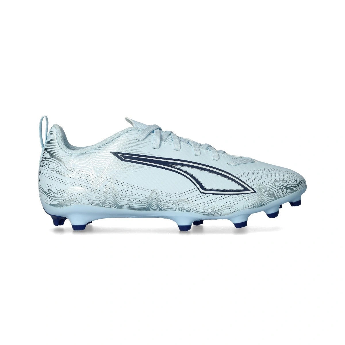Chaussure de football Puma Ultra 6 Play FG/AG pour enfant. Chaussures synthétiques à utiliser sur terrains en gazon artificiel et gazon naturel. Chaussures d’entrée de gamme en couleur Icy Blue-Blue Jewel.
