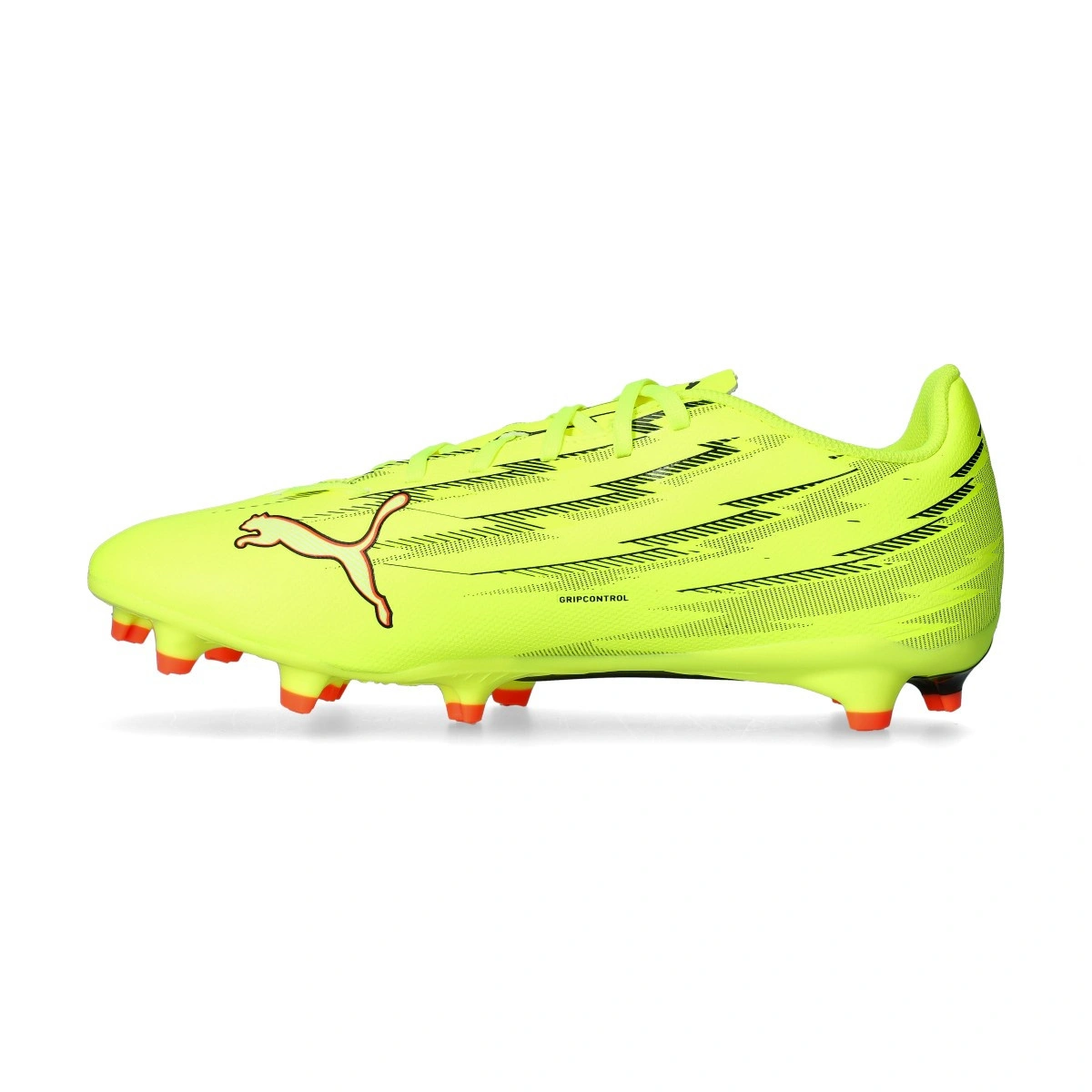 Chaussure de football Puma Ultra 6 Play FG/AG pour adultes. Chaussures synthétiques à utiliser sur terrains en gazon artificiel et gazon naturel. Chaussures d'entrée de gamme en couleur Yellow Alert-Puma Black-Puma Silver-Glowing R.