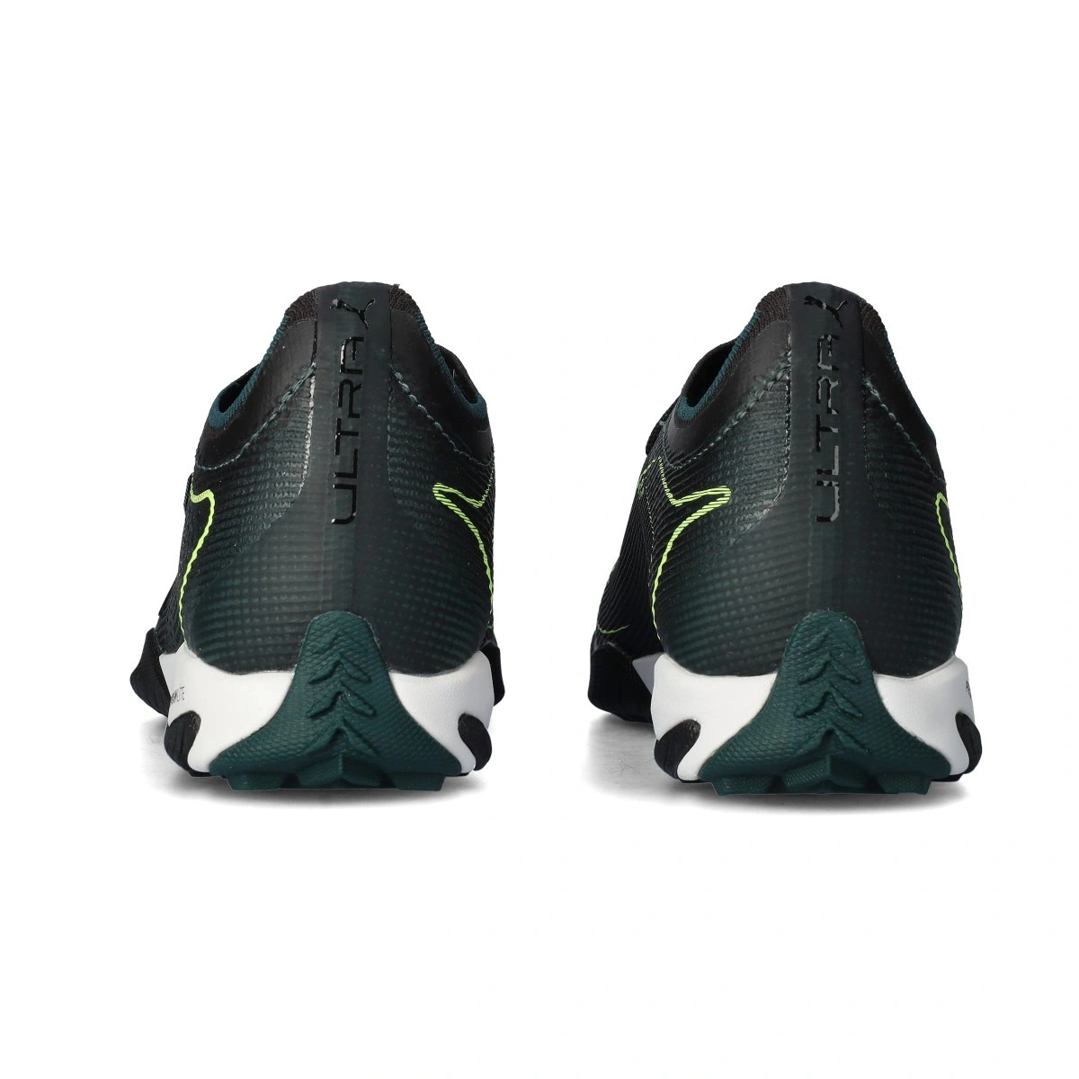 Chaussure de football Puma Ultra 6 Pro Cage Turf. Chaussures en microfibre à utiliser sur les terrains en terre et moquette. Chaussures haut de gamme en coloris Black-Fizzy Light-Green Terrain.