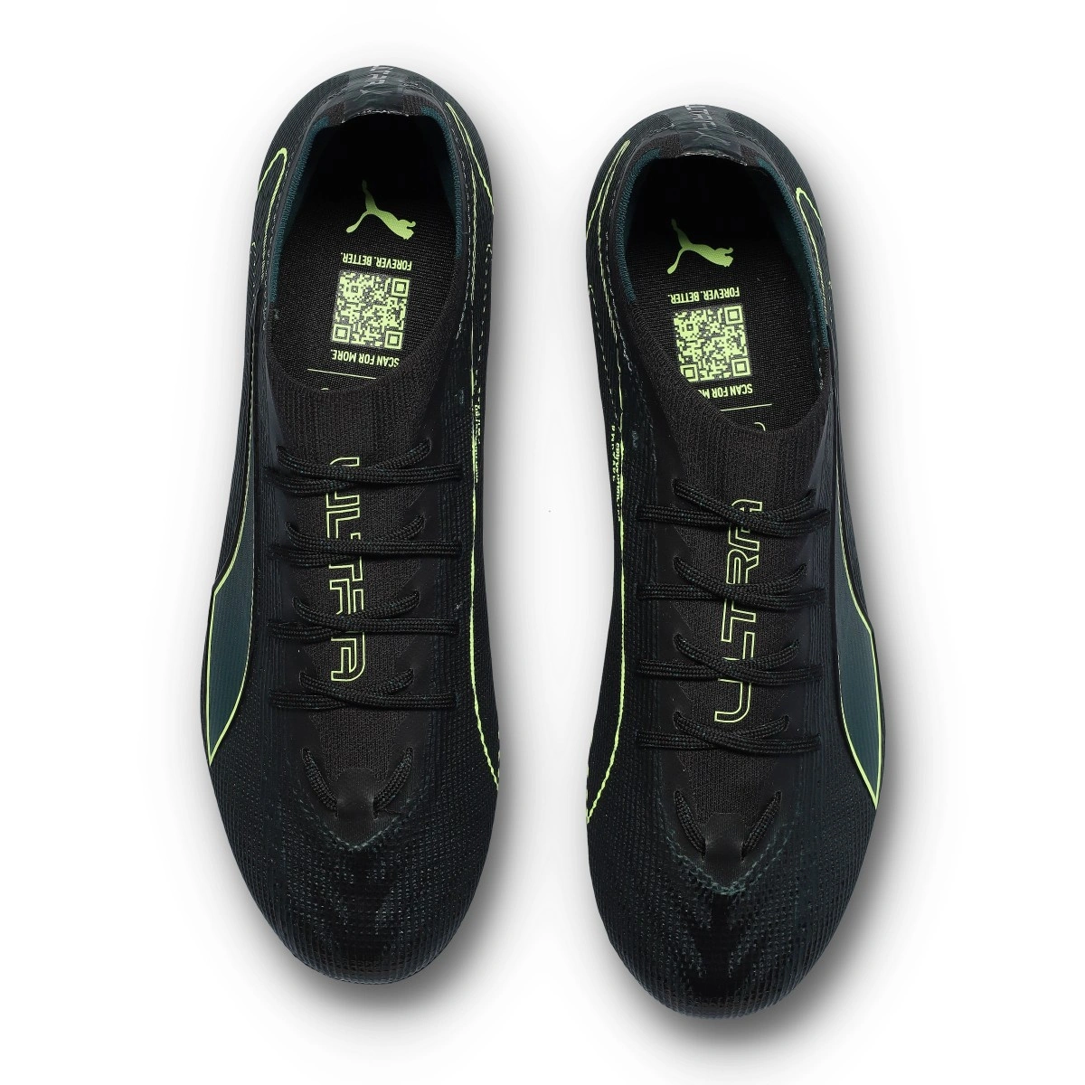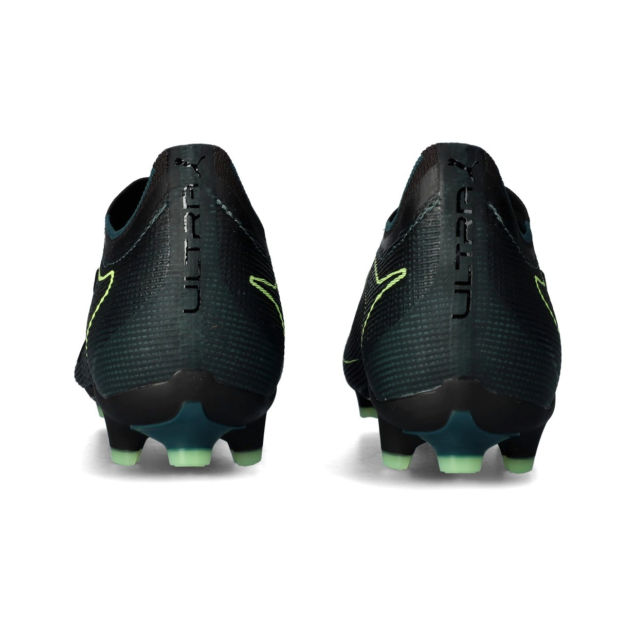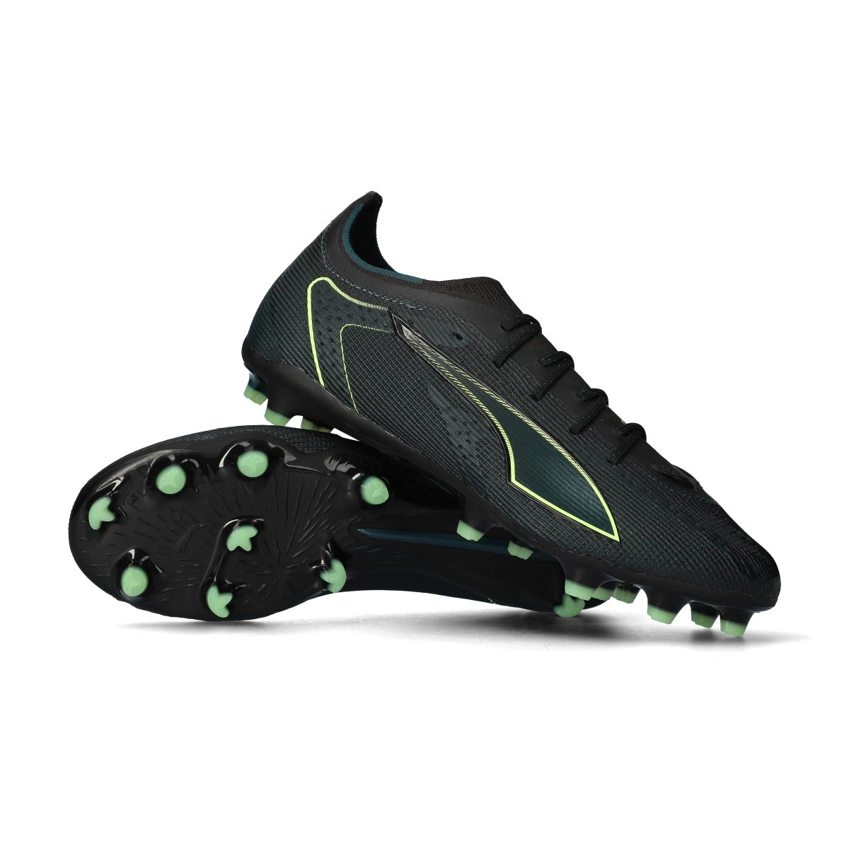 Chaussure de football Puma Ultra Pro FG/AG. Chaussures en microfibre à utiliser sur les terrains en gazon artificiel ou naturel. Chaussures millieu de gamme en coloris Black-Fizzy Light-Green Terrain.