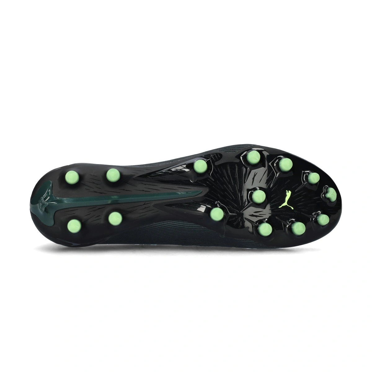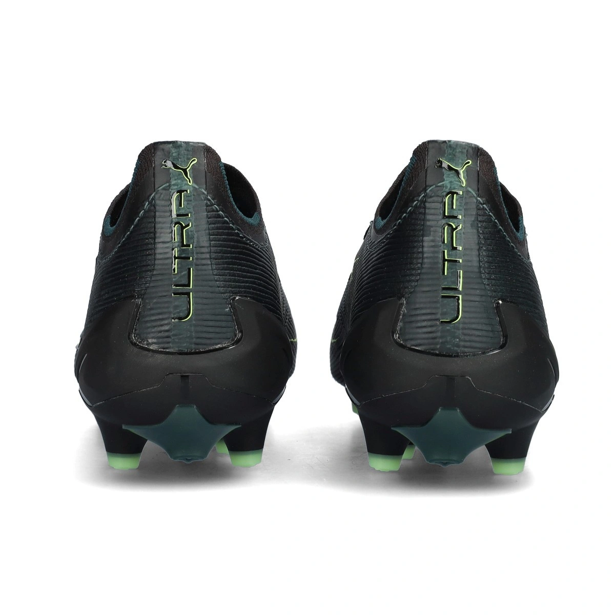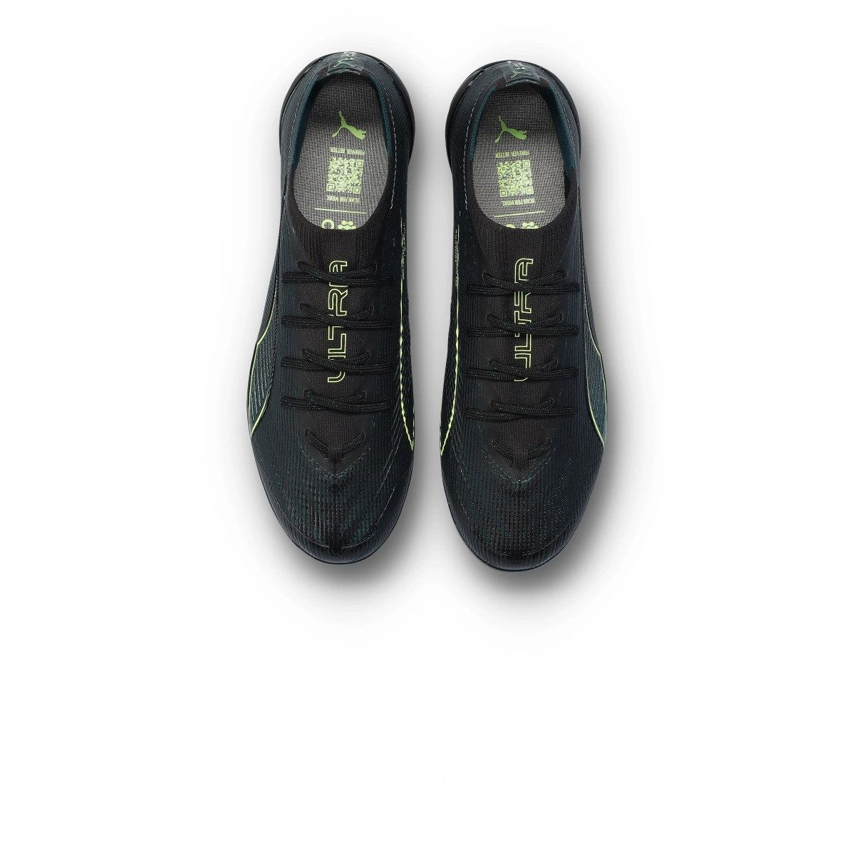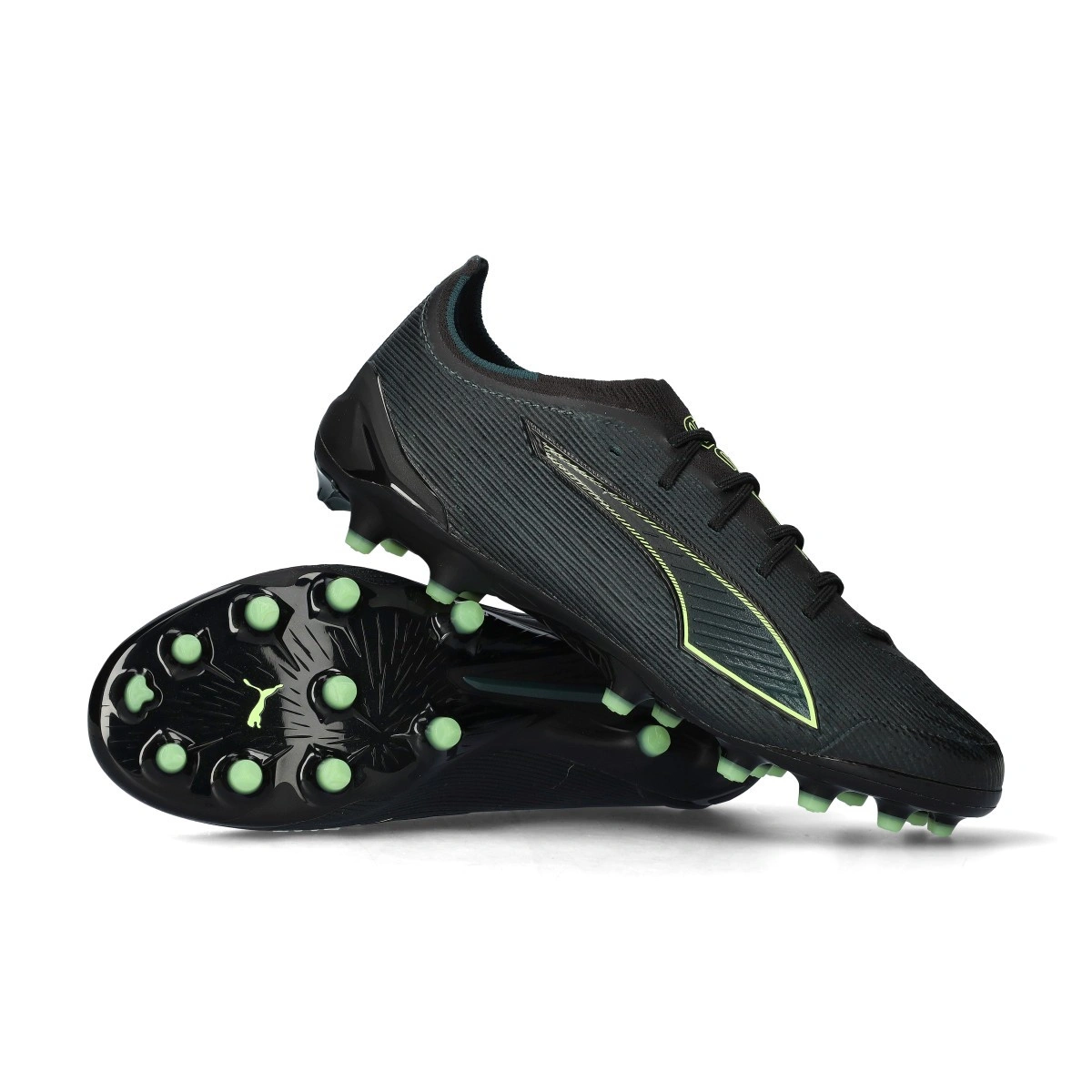 Chaussure de football Puma Ultra 6 Ultimate AG. Chaussures en microfibre conçues pour une utilisation sur terrains en gazon artificiel. Modèle haut de gamme en coloris Black-Fizzy Light-Green Terrain.