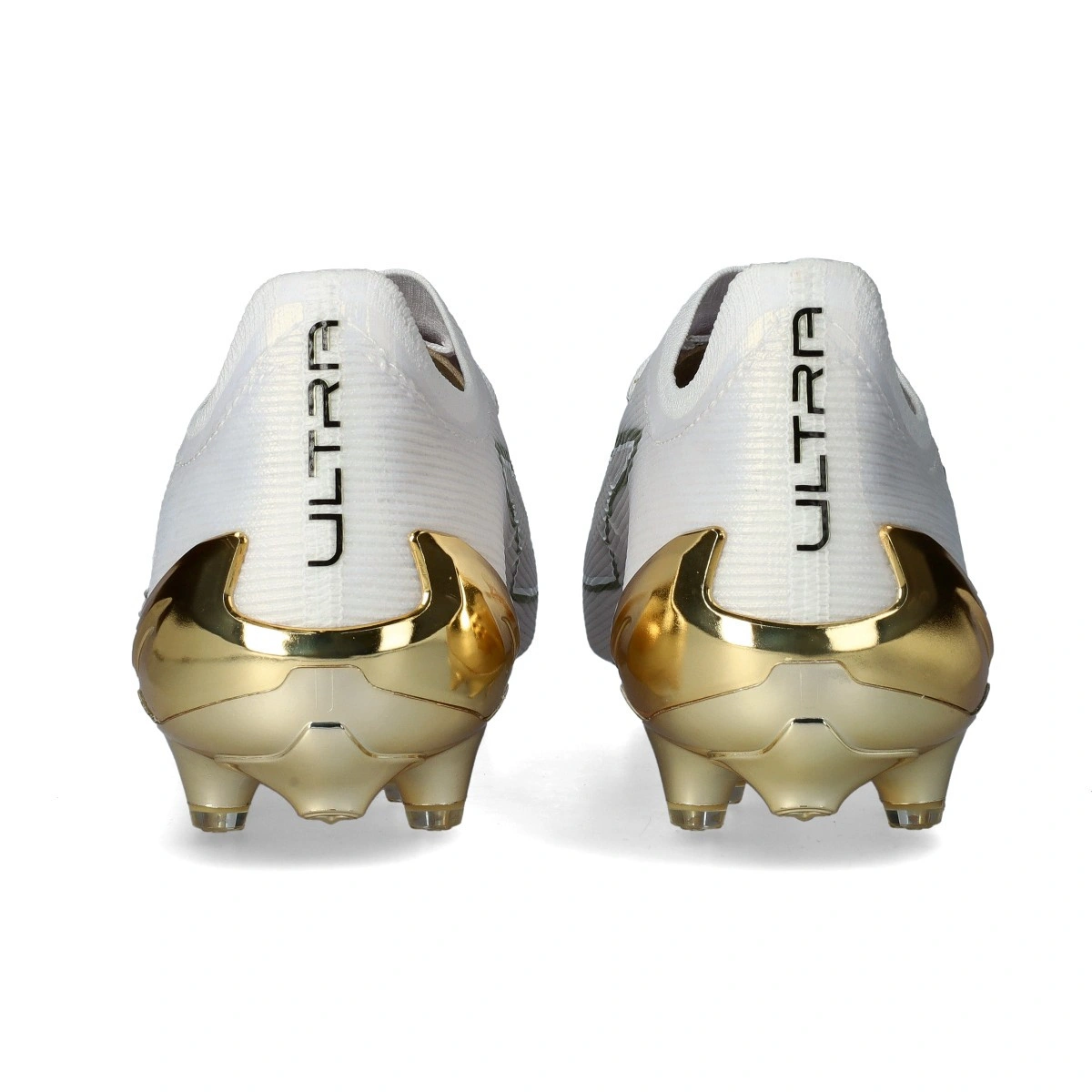 Chaussure de football Puma Ultra 6 Ultimate AG. Chaussures en microfibre pour terrains en gazon artificiel. Chaussures haut de gamme en couleur White-Metallic Gold-Black.
