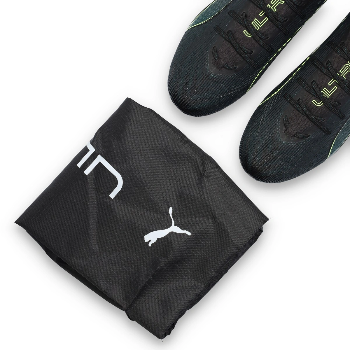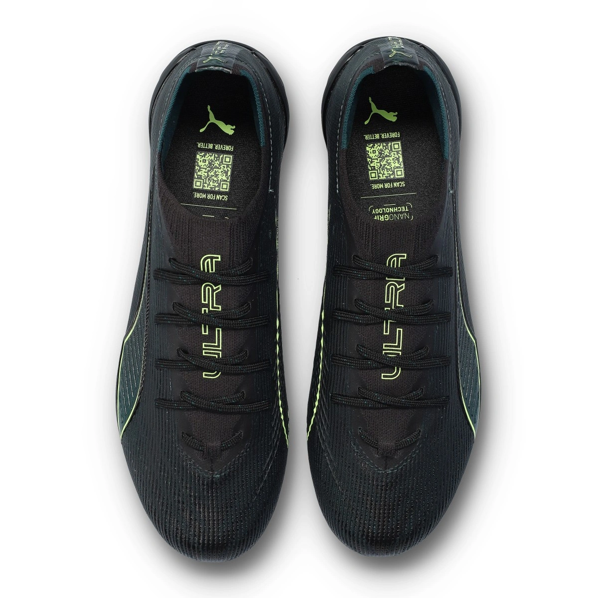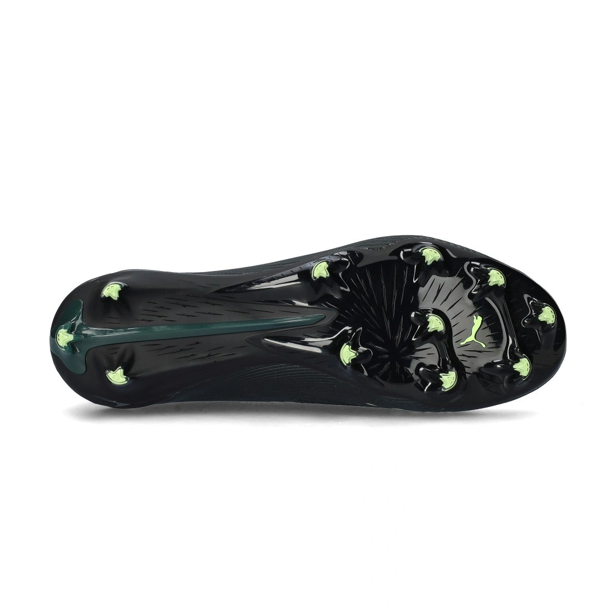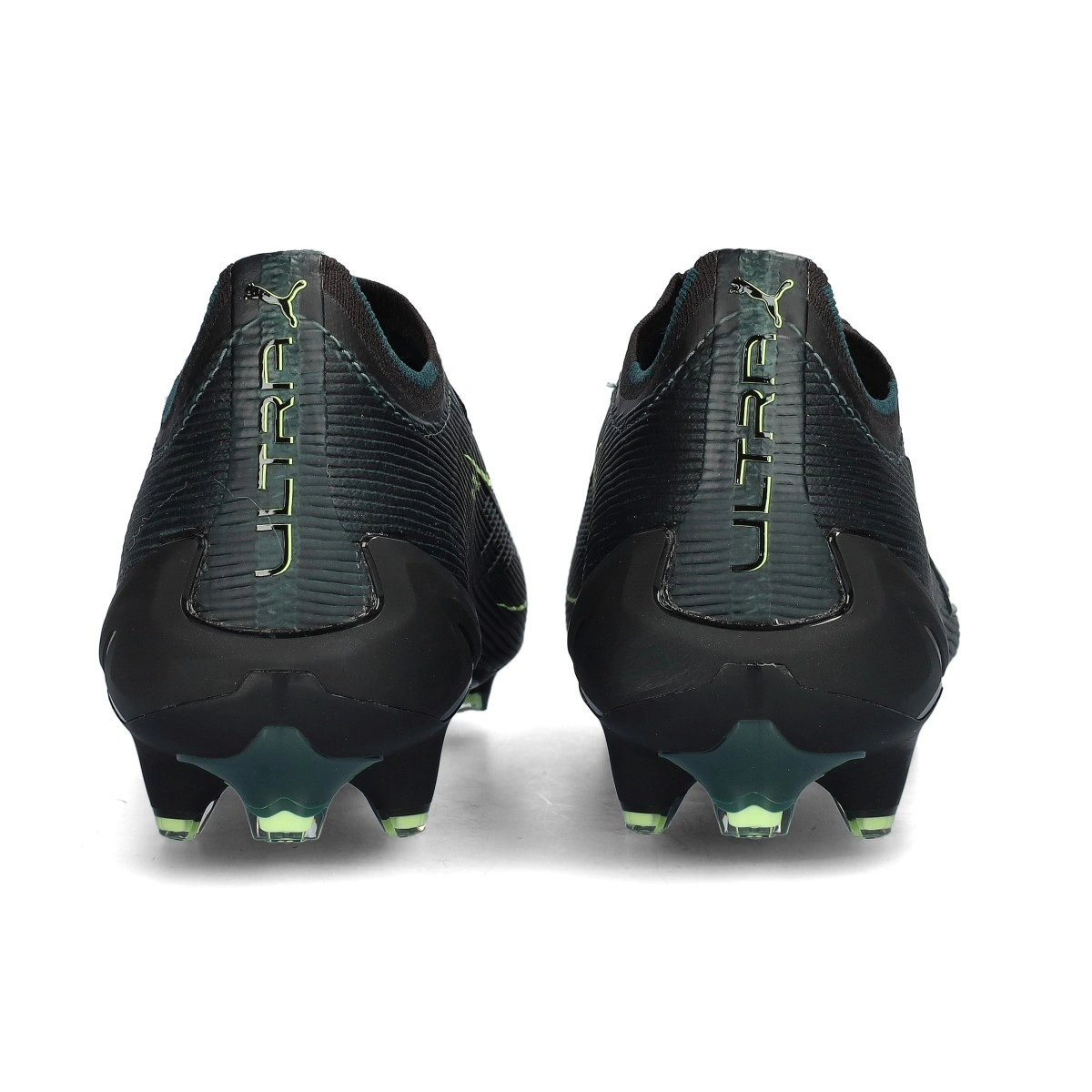 Chaussure de football Puma Ultra 6 Ultimate FG. Chaussures en microfibre conçues pour une utilisation sur terrains en gazon naturel. Modèle haut de gamme en coloris Black-Fizzy Light-Green Terrain.