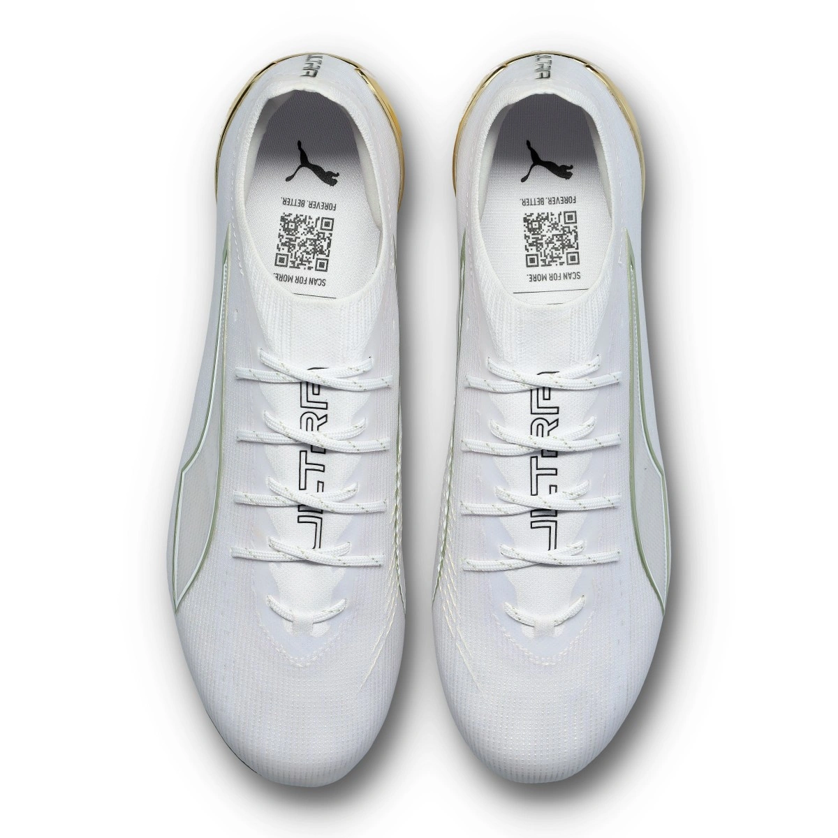 Chaussure de football Puma Ultra 6 Ultimate FG. Chaussures en microfibre pour terrains en gazon naturel. Chaussures haut de gamme en couleur White-Metallic Gold-Black.