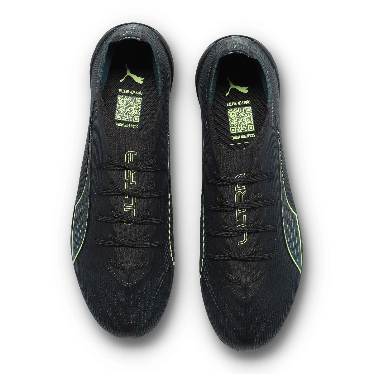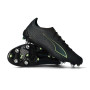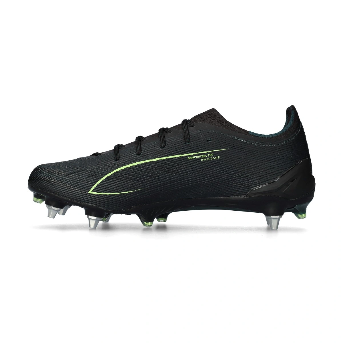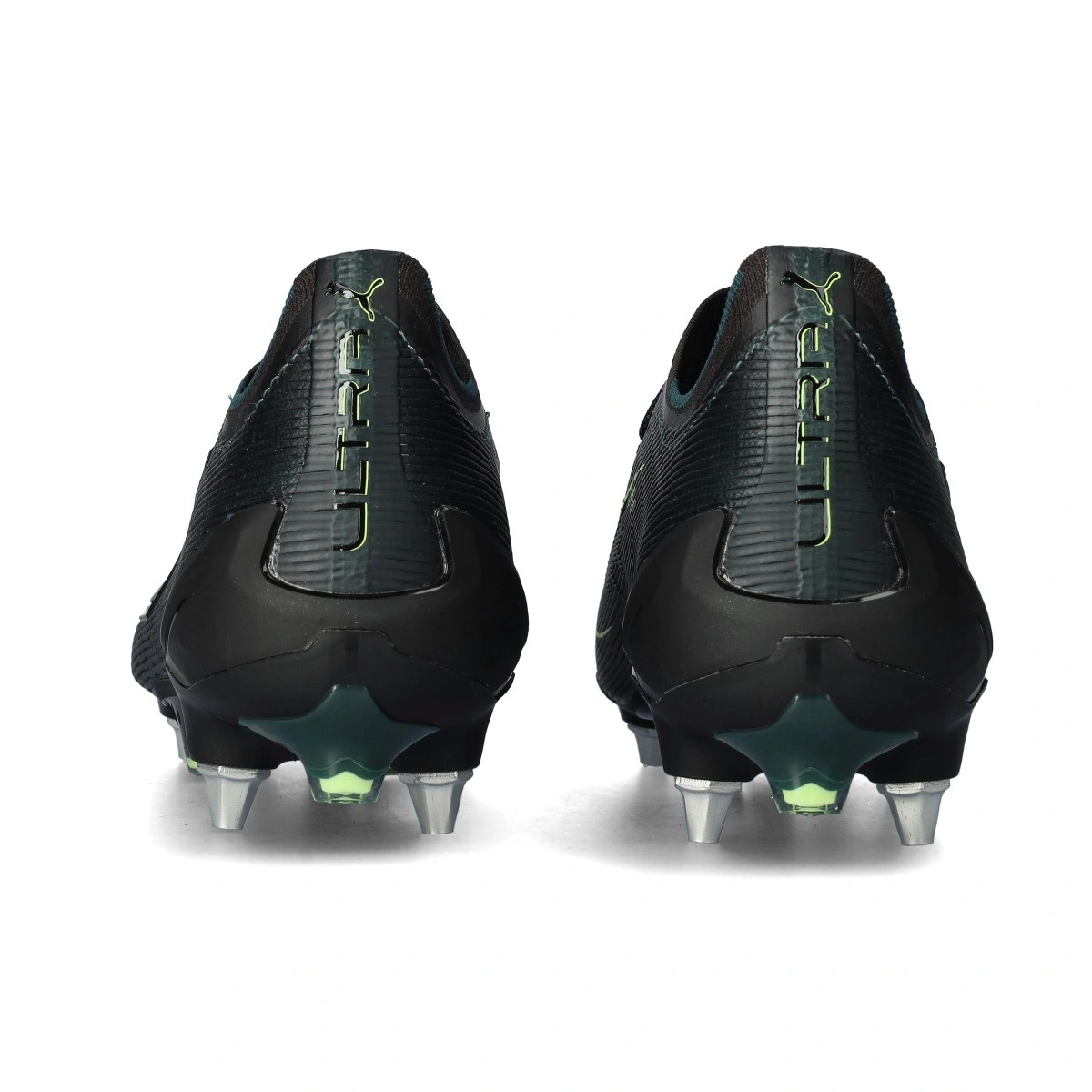 Chaussure de football Puma Ultra 6 Ultimate MxSG. Chaussures en microfibre conçues pour une utilisation sur terrains en gazon naturel humide ou boueux. Modèle haut de gamme en coloris Black-Fizzy Light-Green Terrain.