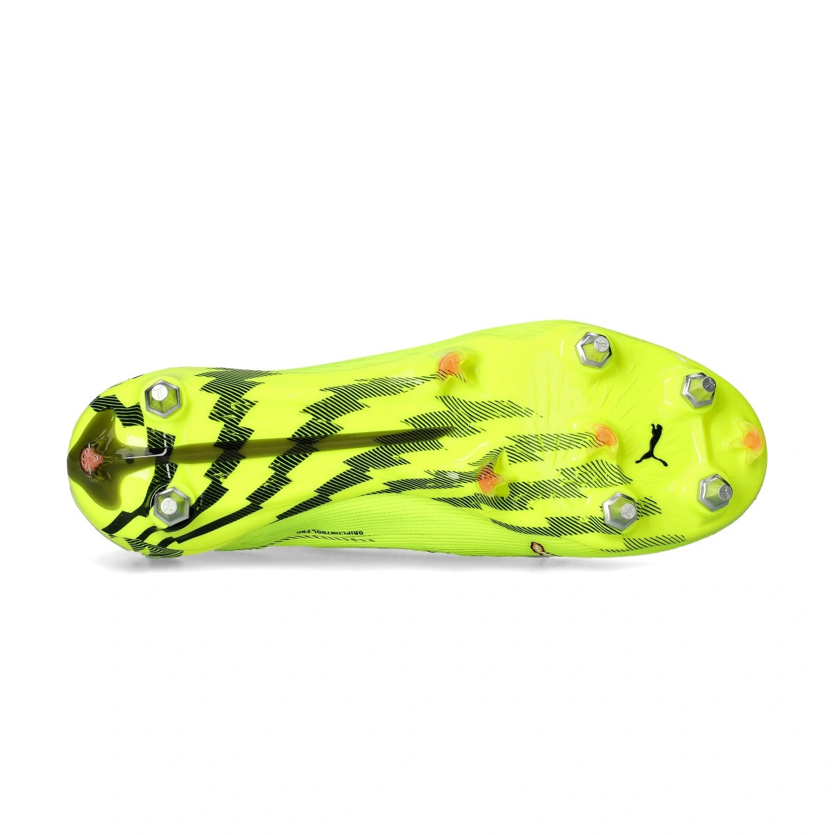 Chaussure de football Puma Ultra 6 Ultimate MxSG. Chaussures en microfibre à utiliser sur terrains en gazon naturel humide ou boueux. Chaussures haut de gamme en couleur Yellow Alert-Black-Silver-Glowing.
