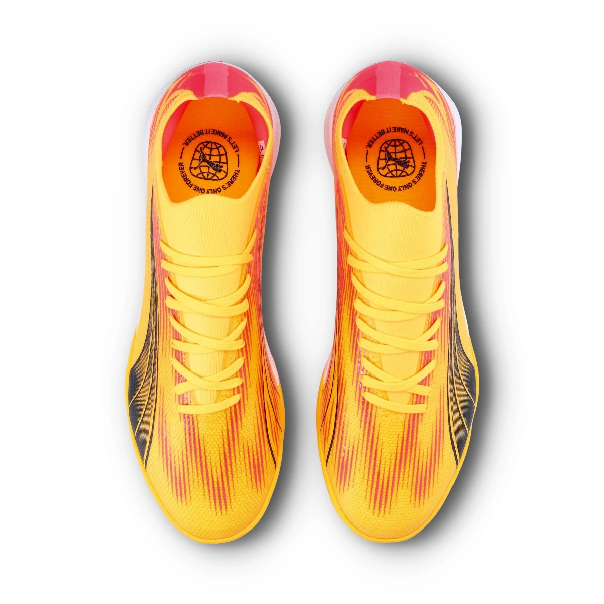 Chaussures de football Puma Ultra Match TT. Chaussures synthétiques à utiliser sur les terrains en gazon artificiel et en moquette. Chaussures de la gamme de base en couleur Yellow Blaze-White-Black.