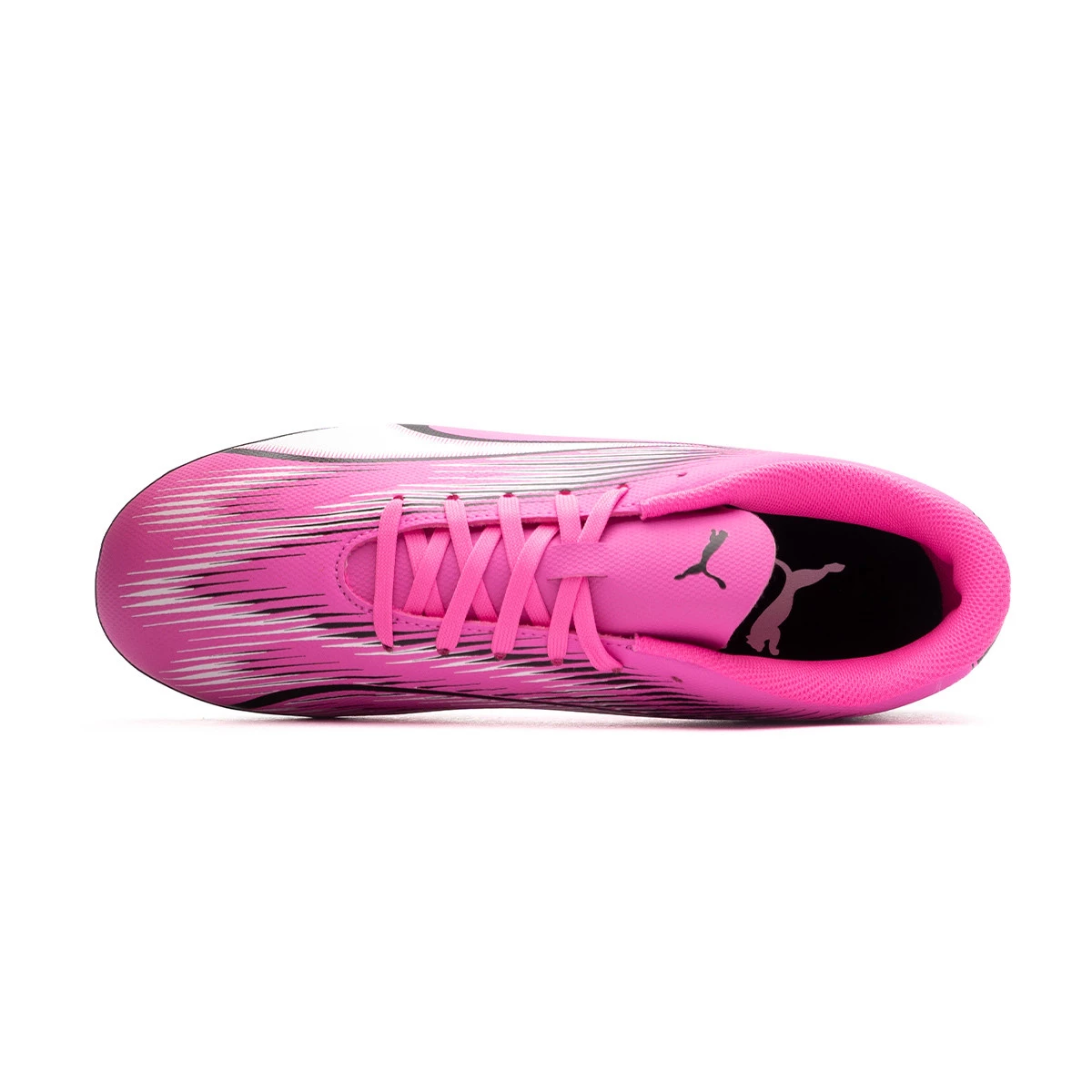 Chaussure de football Puma Ultra Play MG pour enfants. Bottes synthétiques à utiliser sur terrains en gazon artificiel et de moquette. Chaussures bas de gamme en couleur Poison Pink-White-Black.