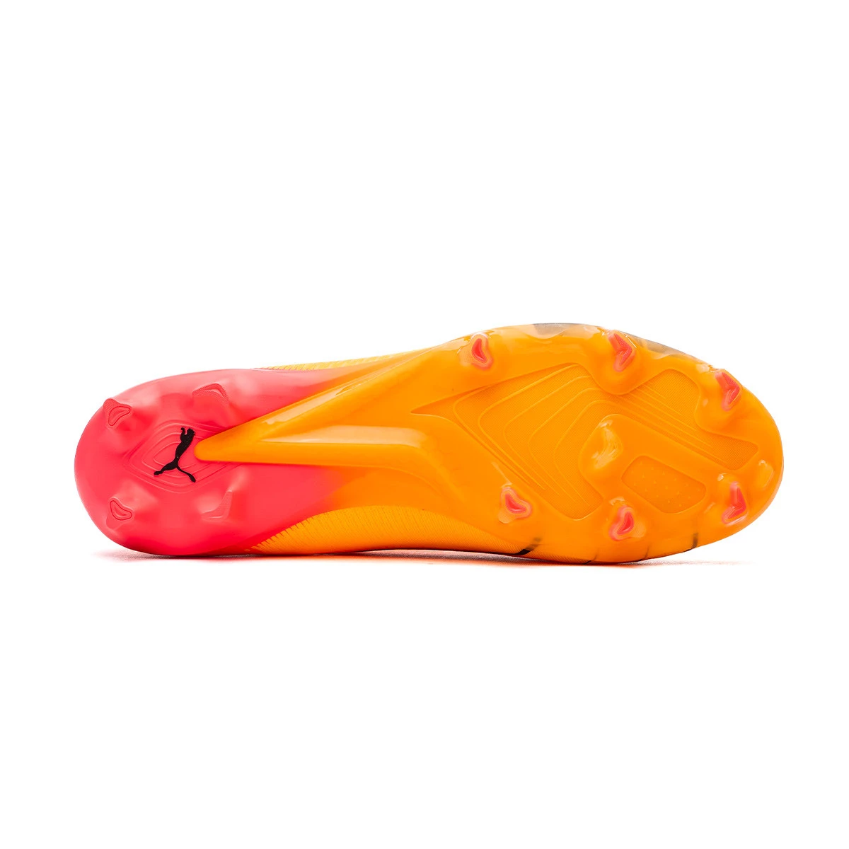 Chaussures de football Puma Ultra Ultimate Rush FG/AG. Chaussures en microfibre à utiliser sur les terrains en gazon naturel et en gazon artificiel de pointe. Chaussures haut de gamme en Sun Stream-Black-Sunset Glow.