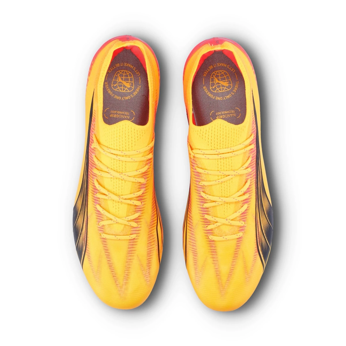 Chaussures de football Puma Future 7 Ultimate MG. Chaussures en fil, pour utilisation sur gazon naturel, gazon artificiel de toute génération, moquette ou terre. Chaussures haut de gamme en couleur Sun Stream-Black-Sunset Glow, pour les joueurs expérimentés.
