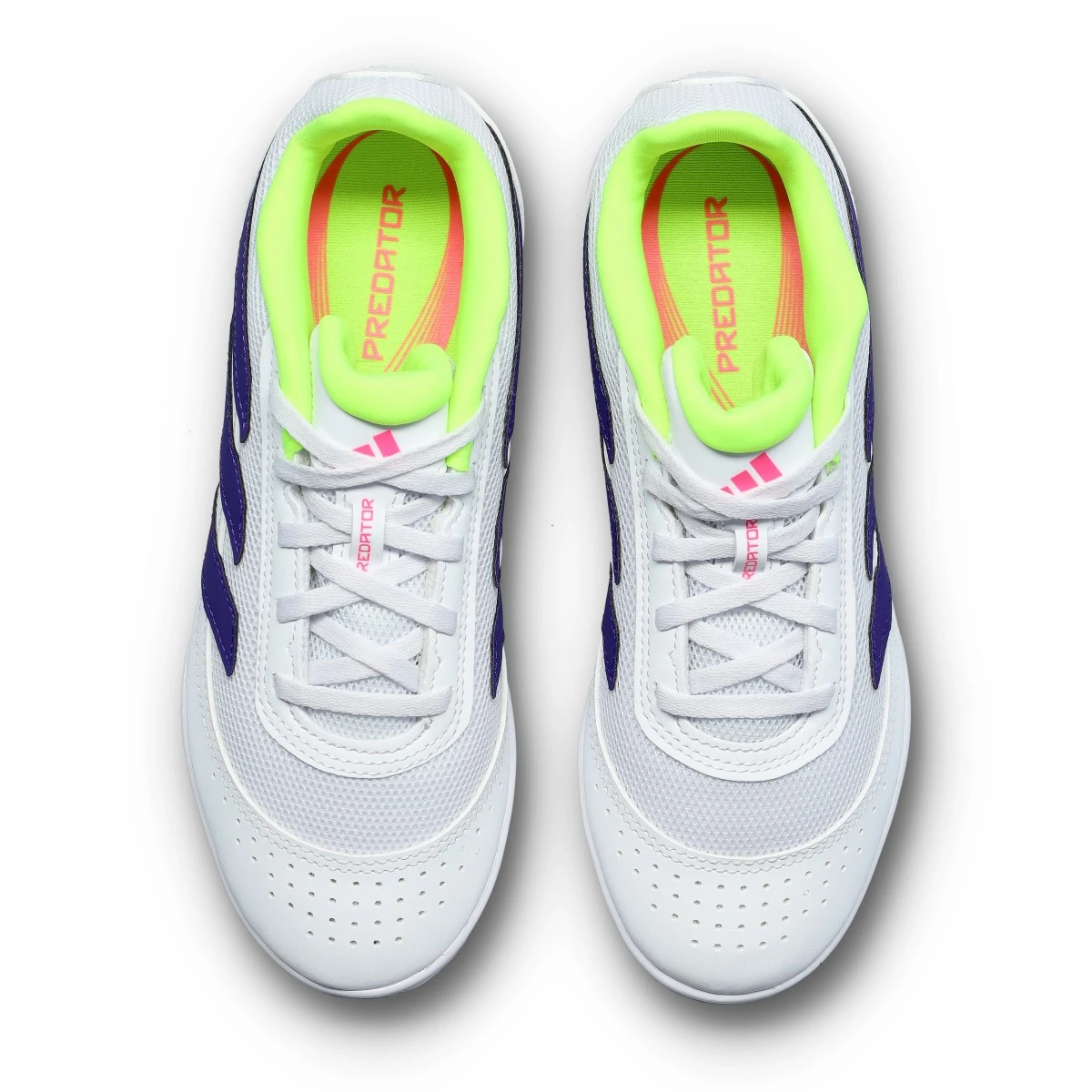 Chaussures adidas Predator Club IN Sala en Ftwr White-Collegiate Purple-Lucid Lemon pour enfants.  Une chaussure de base pour les terrains intérieurs.