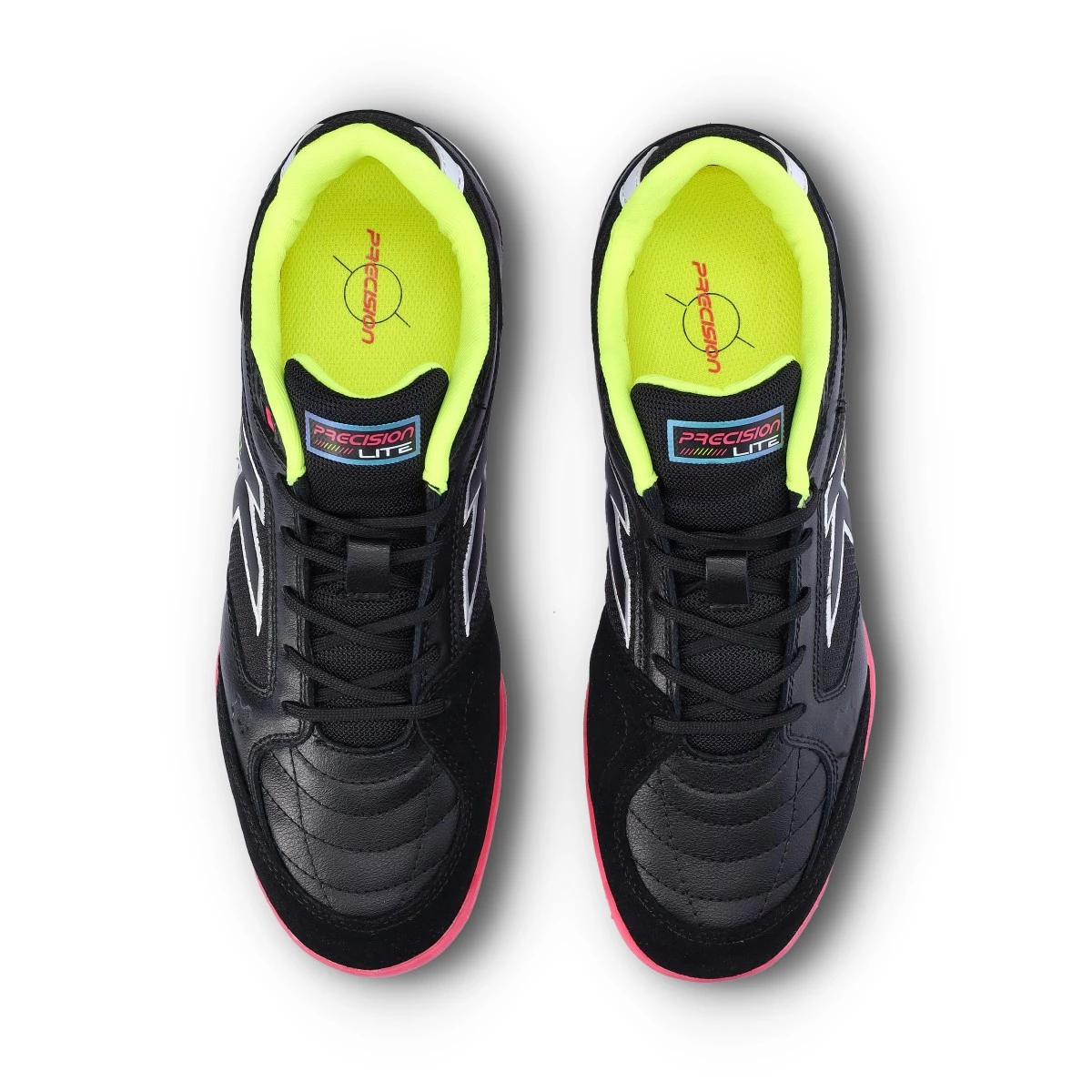 Chaussure de Football en Salle de couleur noire. Nouvelle évolution du modèle vedette Precision, cette fois la Precision Lite incorpore du cuir de vachette de première qualité pour créer une chaussure d'une durabilité et d'une adaptation au pied exceptionnelles.