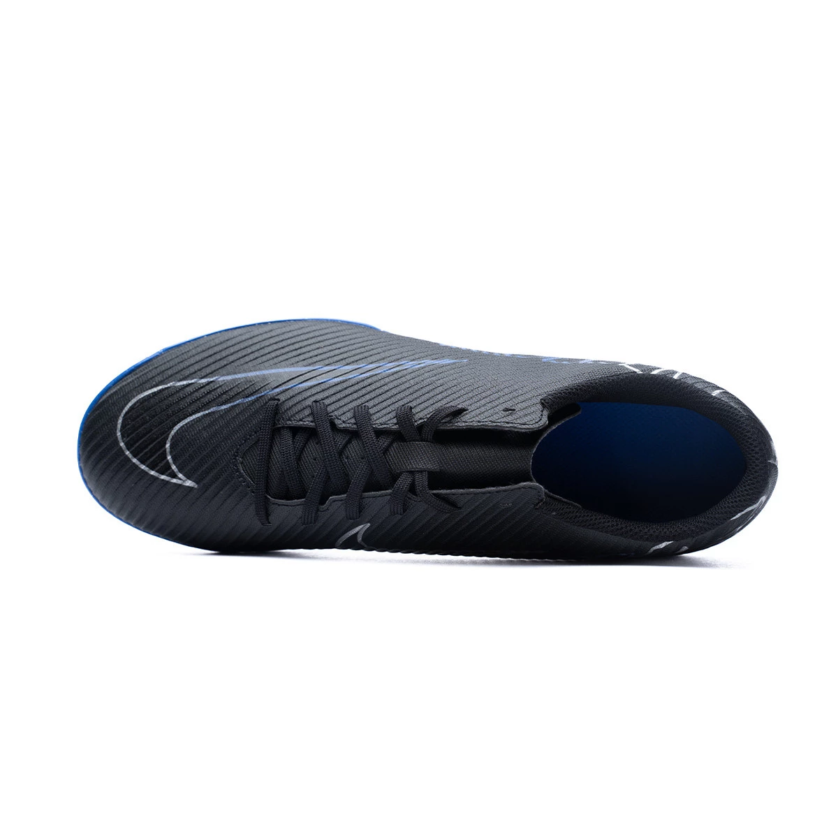 Enfants Nike Mercurial Vapor 15 Club IC chaussure de futsal. Chaussure de court synthétique pour une utilisation sur les courts intérieurs. Chaussure bas de gamme en couleur YBlack-Chrome-Hyper Royal, pour les joueurs de vitesse.