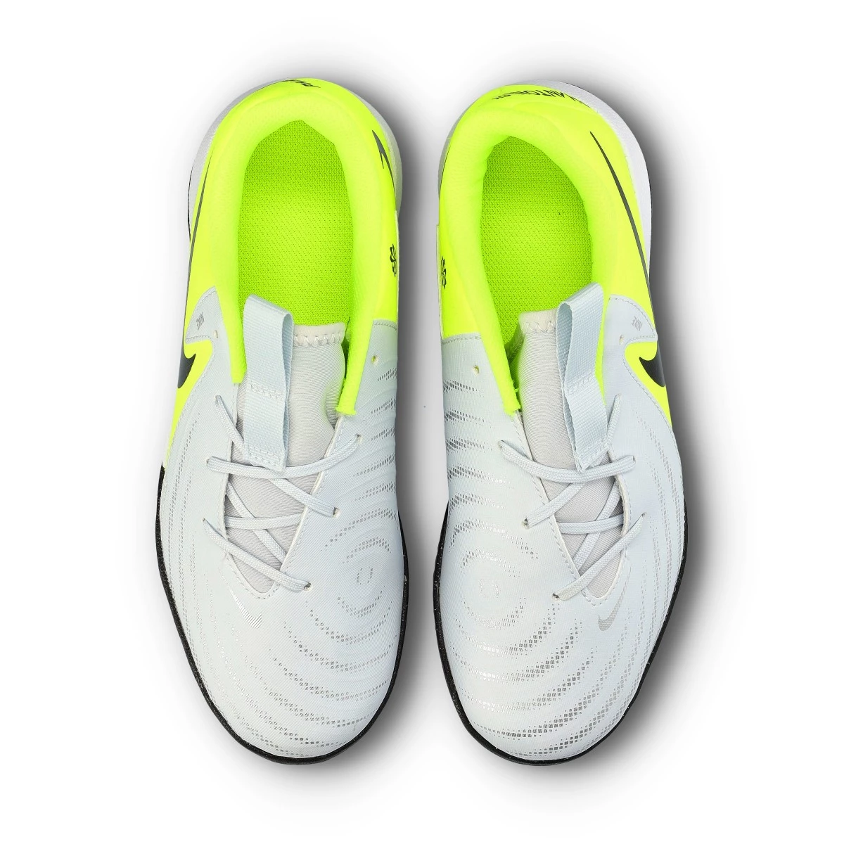 Chaussures de football Nike Phantom GX II Academy IC pour enfant. Modèles en cuir synthétique à utiliser en intérieur ou en extérieur. Chaussures de gamme basse pour les joueurs de contrôle et de précision en couleur Mtlc-Silver-Black-Volt.