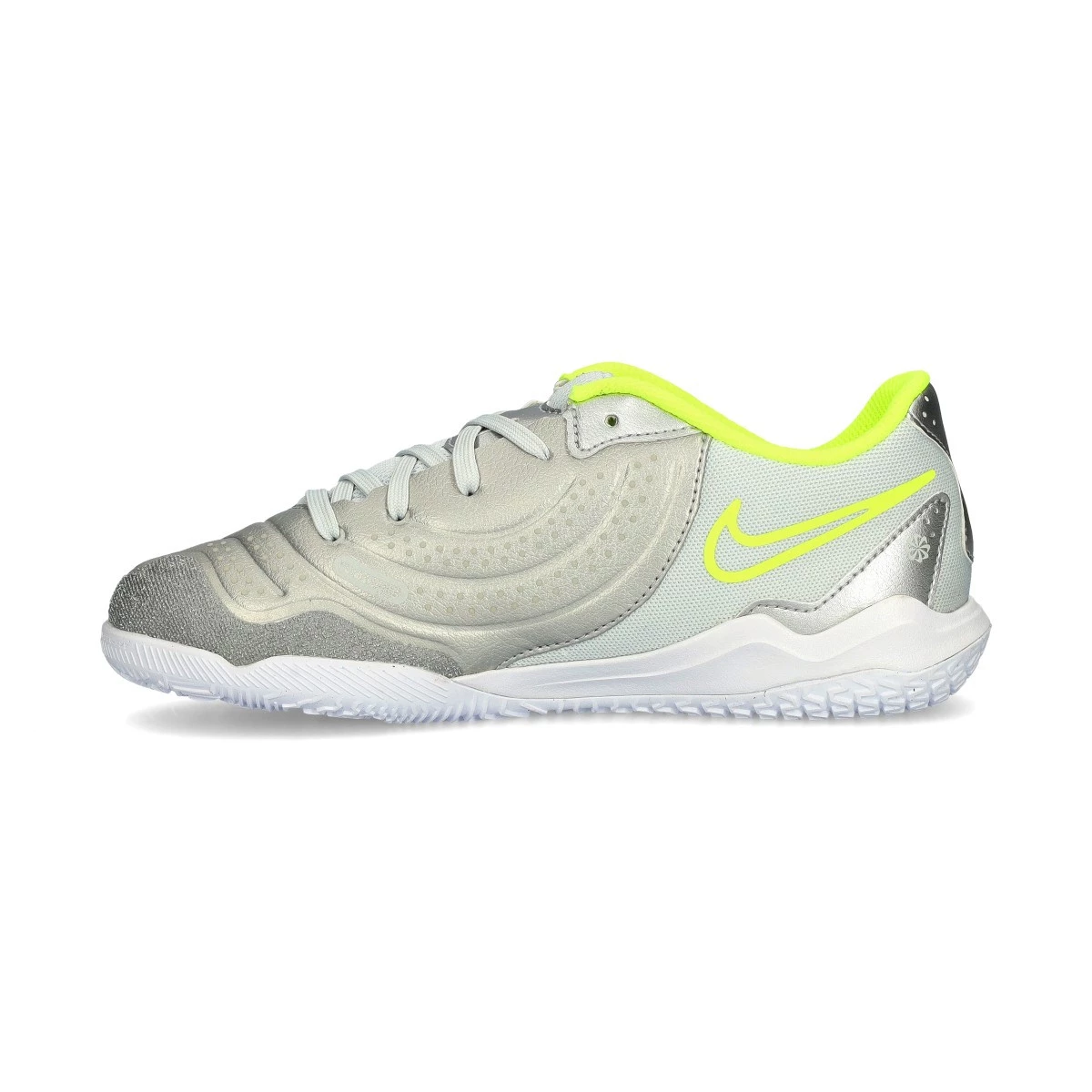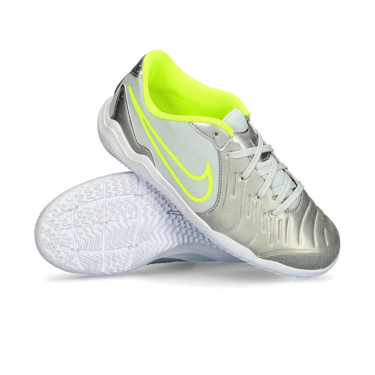 Chaussures de football en salle Nike Tiempo Legend 10 Academy IC pour adulte. Modèles en cuir naturel, à utiliser sur des terrains intérieurs. Chaussures de gamme pro en couleur Mtlc Silver-Black-Volt.