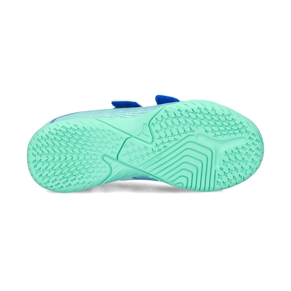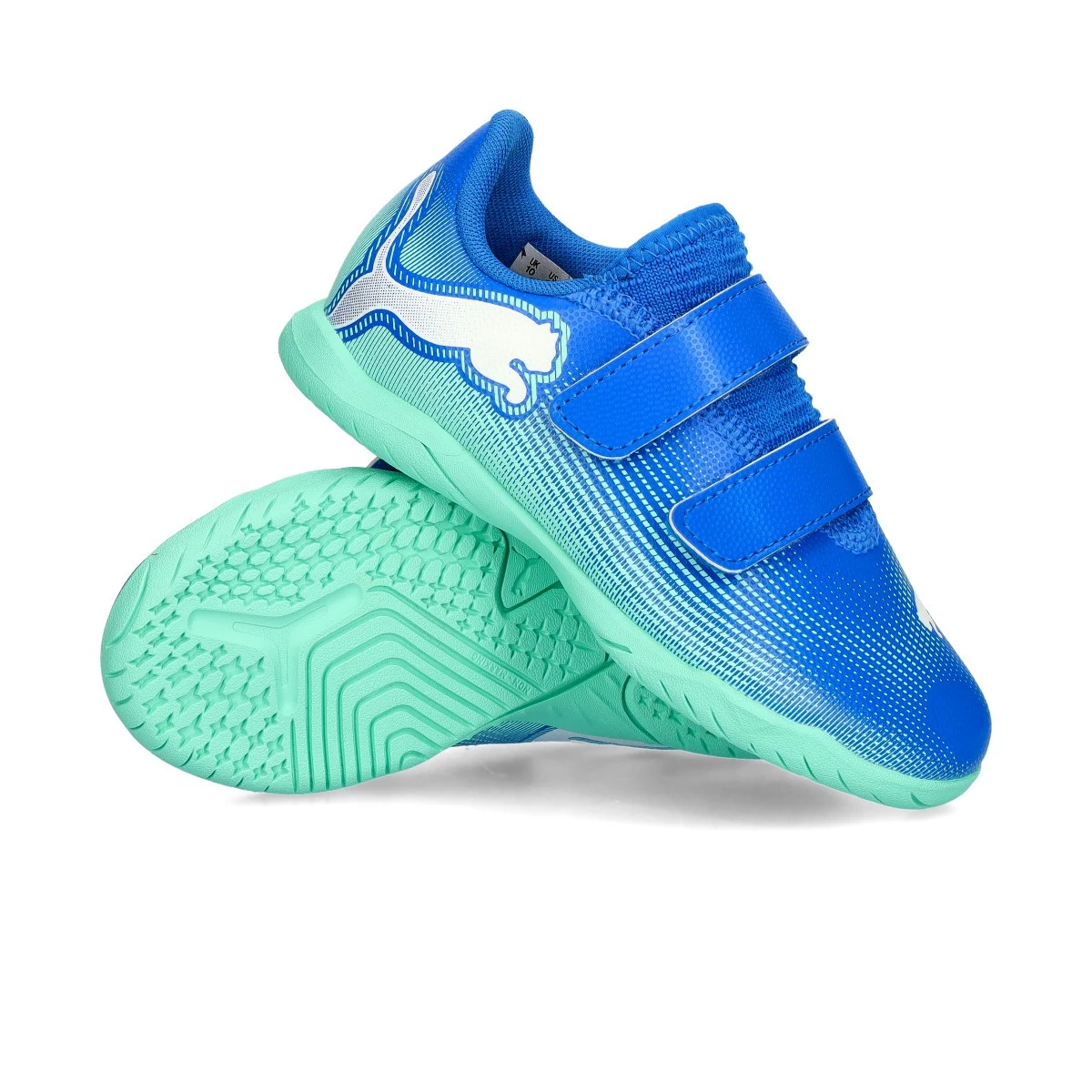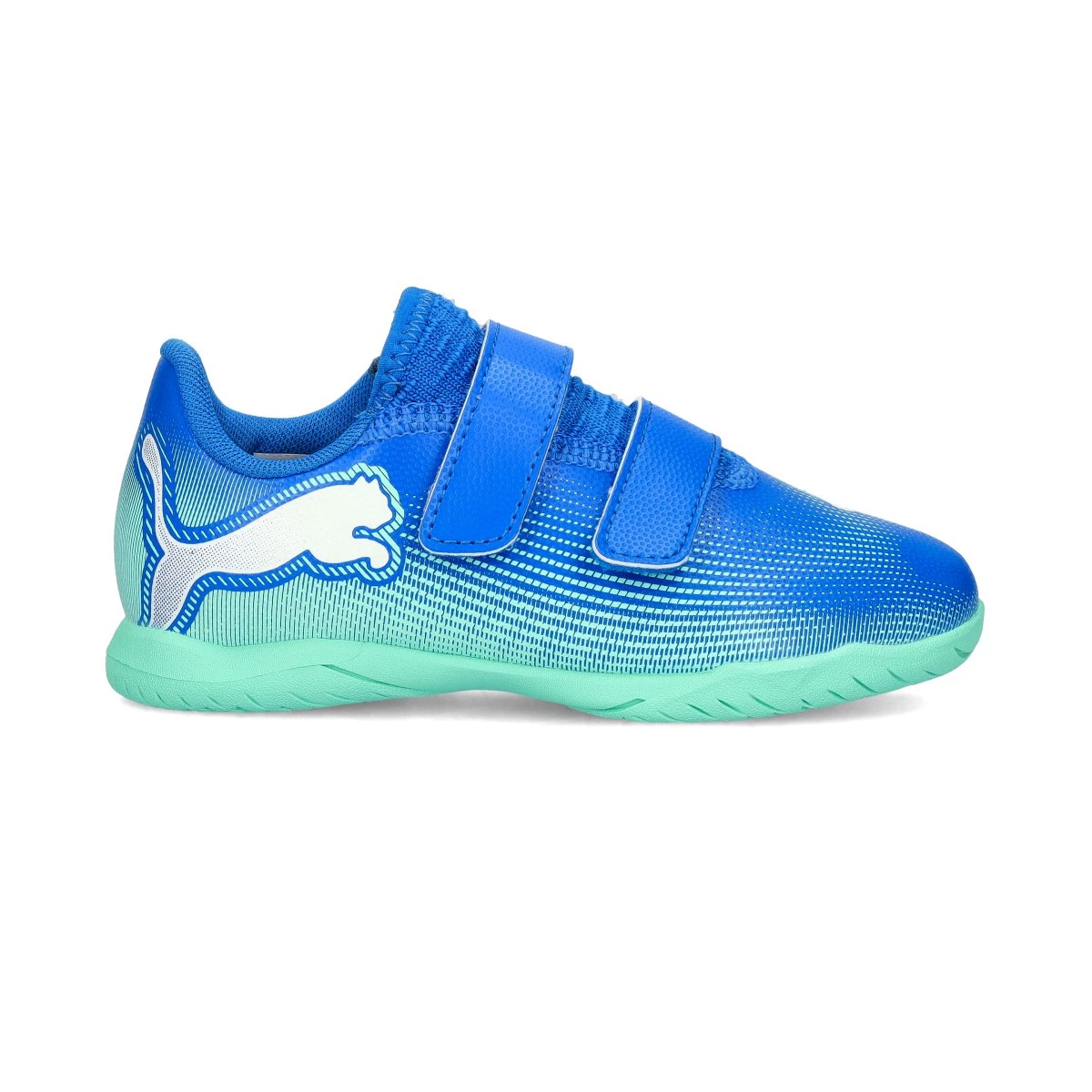 Chaussures de futsal Puma Future 7 Play IT avec bande adhésive pour enfants. Chaussures synthétiques pour utilisation sur terrains intérieurs. Chaussures haut de gamme en couleur Hyperlink Blue-Mint-White.