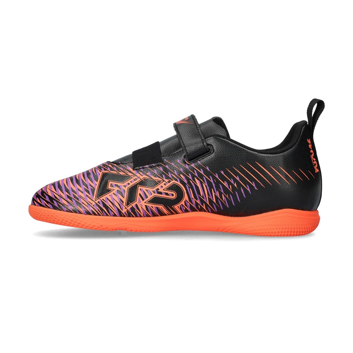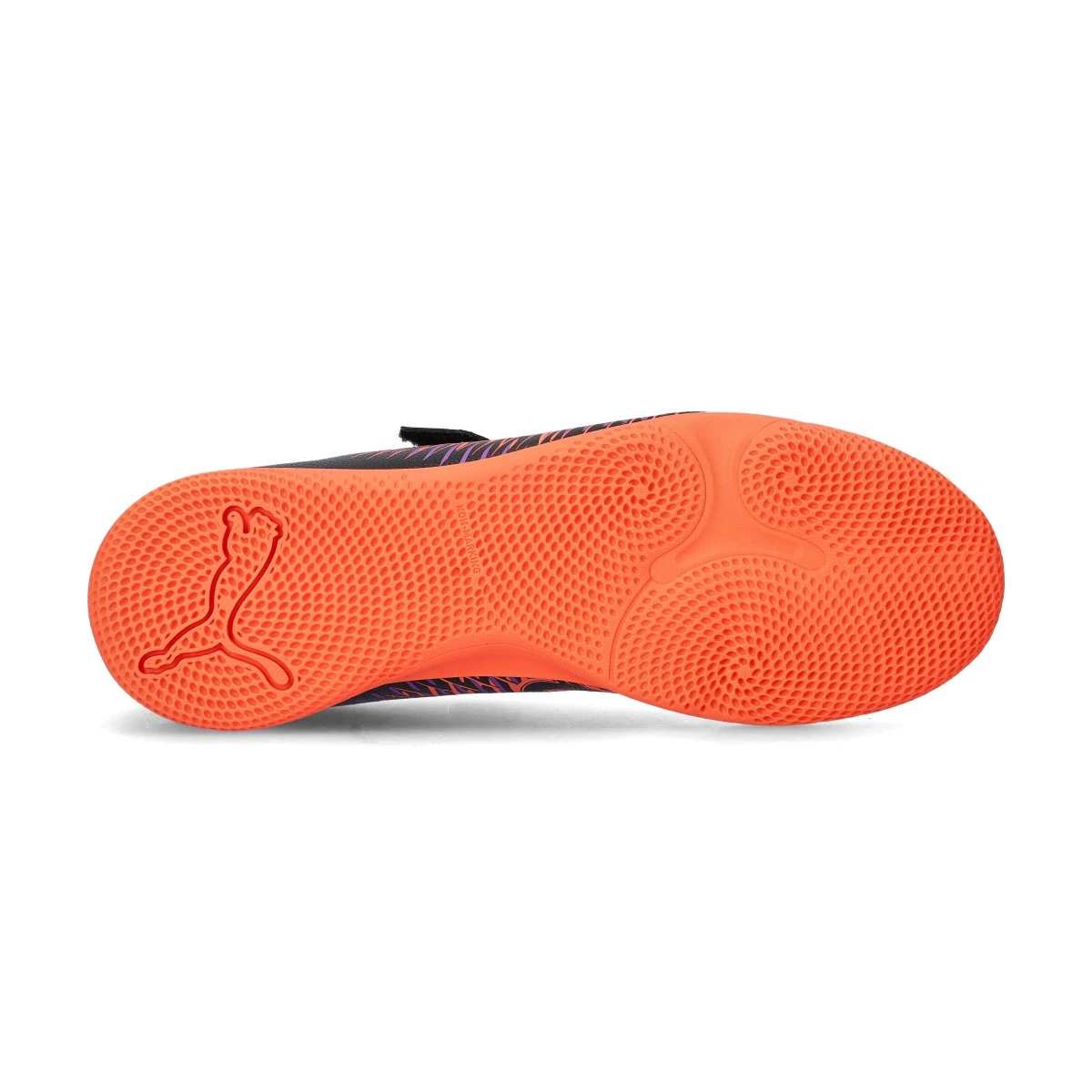 Chaussures de futsal Puma Future 7 Play IT avec bandes pour enfants. Chaussures synthétiques pour utilisation sur terrains intérieurs. Chaussures haut de gamme en Black- White-Glowing Red.