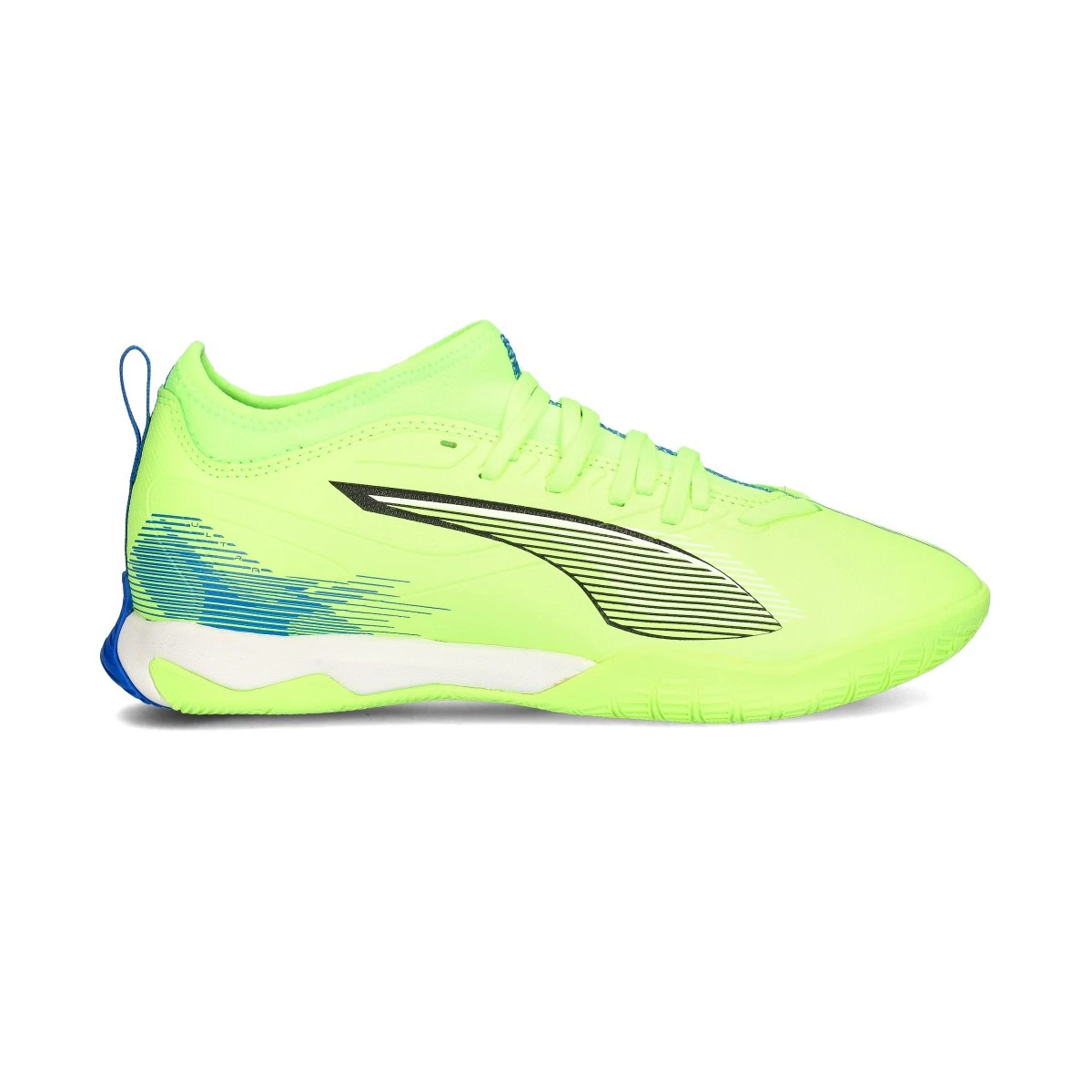 Chaussures de futsal Puma Ultra Match IT+ Mid pour enfants. Chaussures synthétiques sans lacets à utiliser sur les terrains en parquet ou ciment. Chaussures bas de gamme en coloris Fizzy Apple-White-Bluemazing.